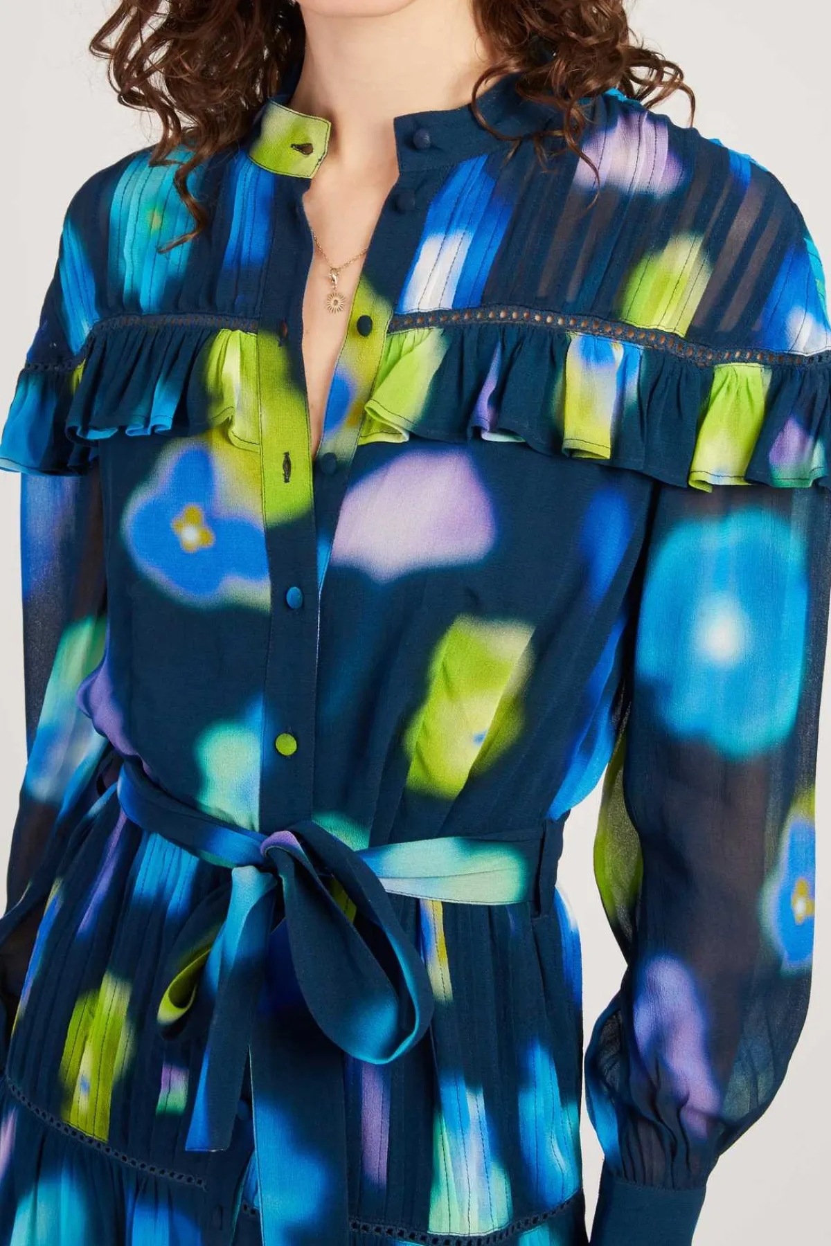Robe chemise manches longues à imprimé floral. Mousseline fluide et légère aux teintes vives. Col rond avec des boutons jusqu’en bas. Taille cintrée avec ceinture fine assortie. Jupe évasée avec un volant jusqu’aux genoux. Sa coupe fluide apporte une silhouette élégante et féminine.