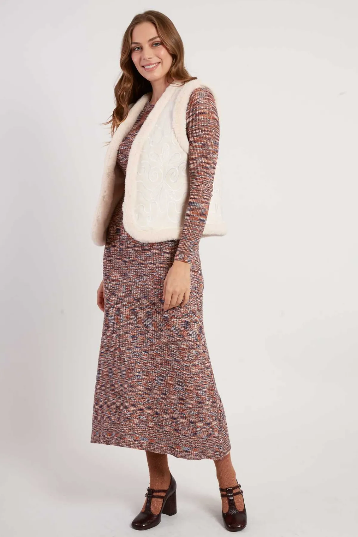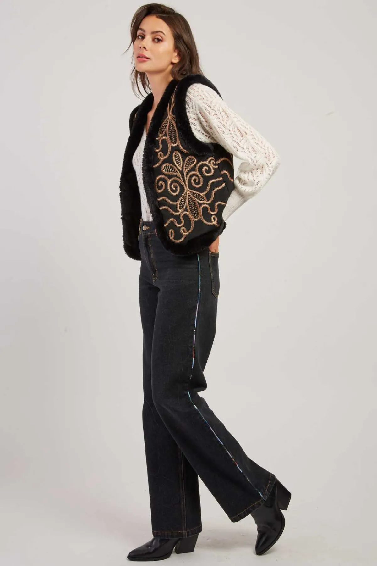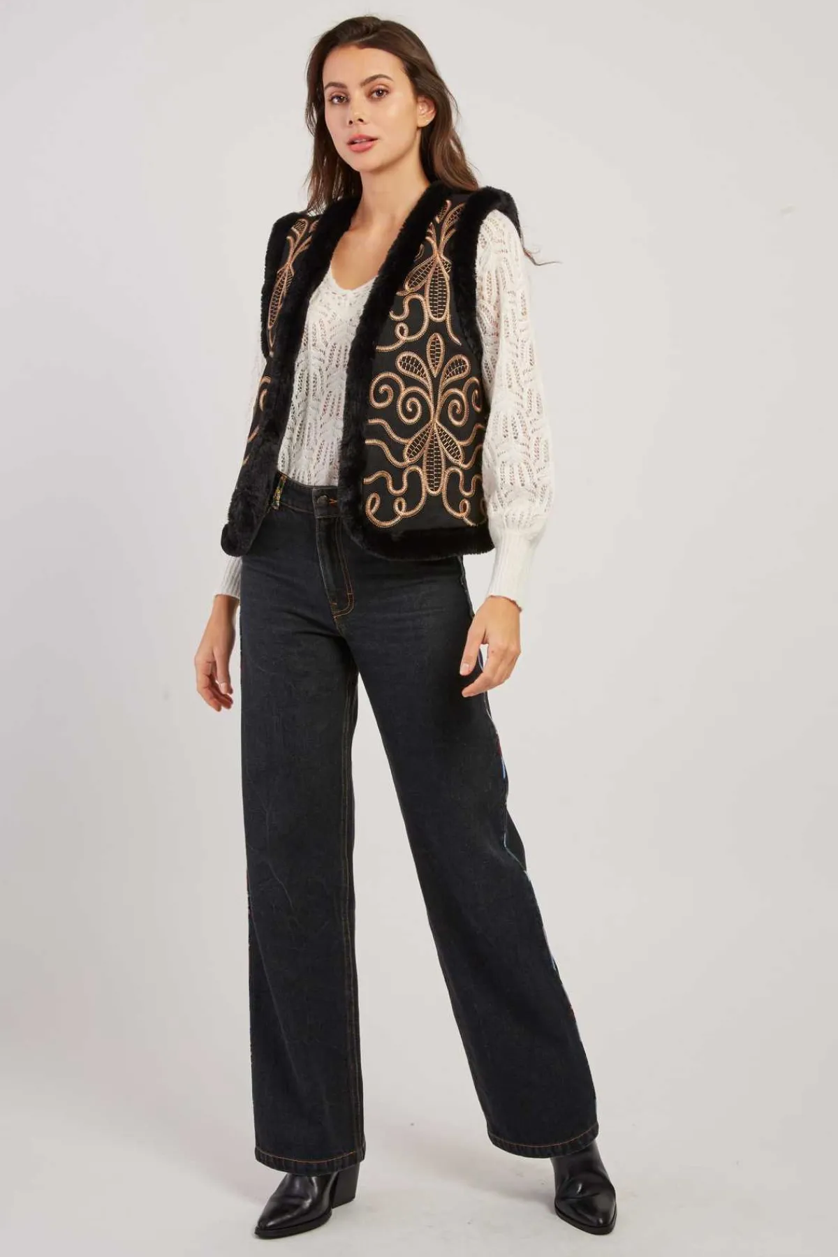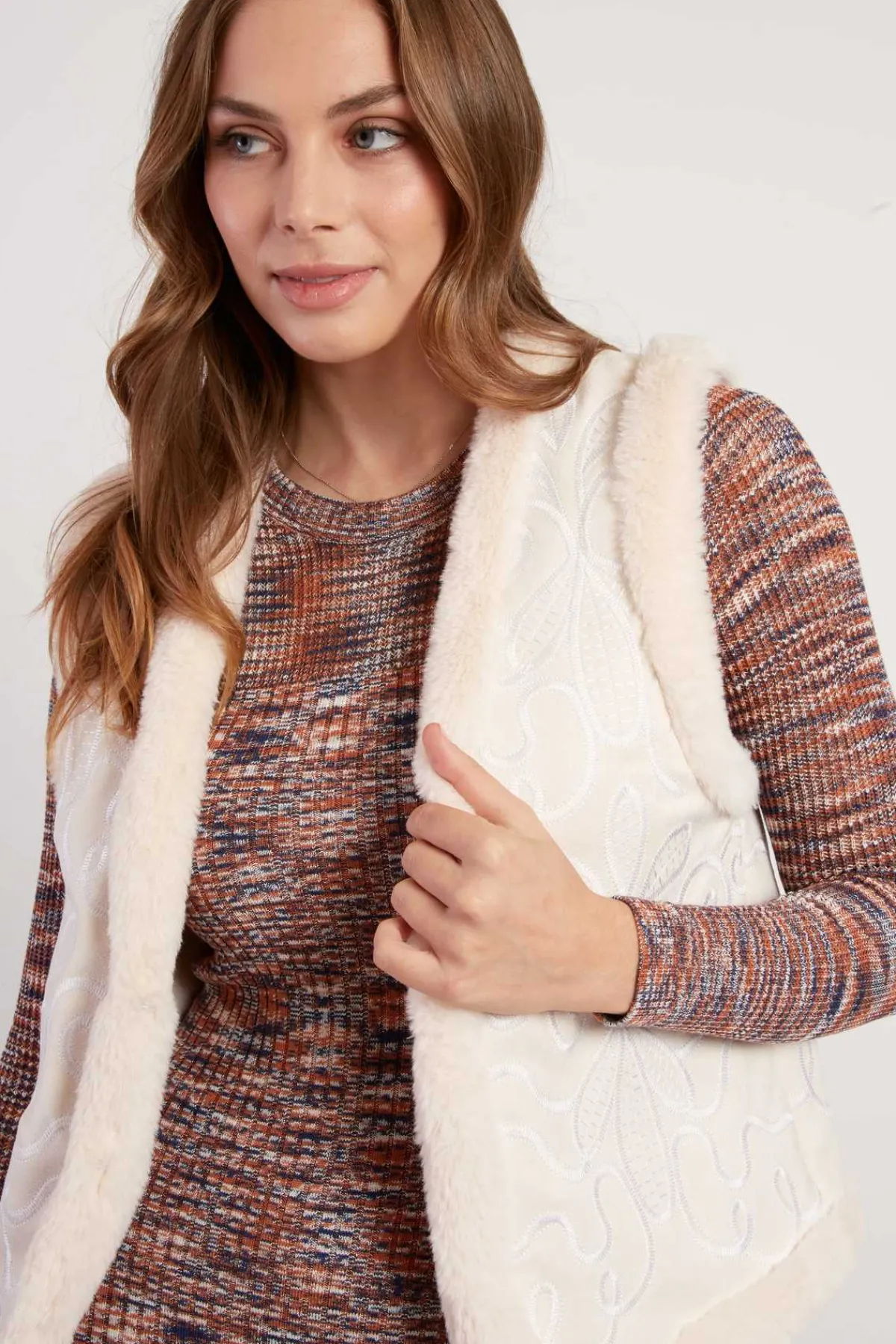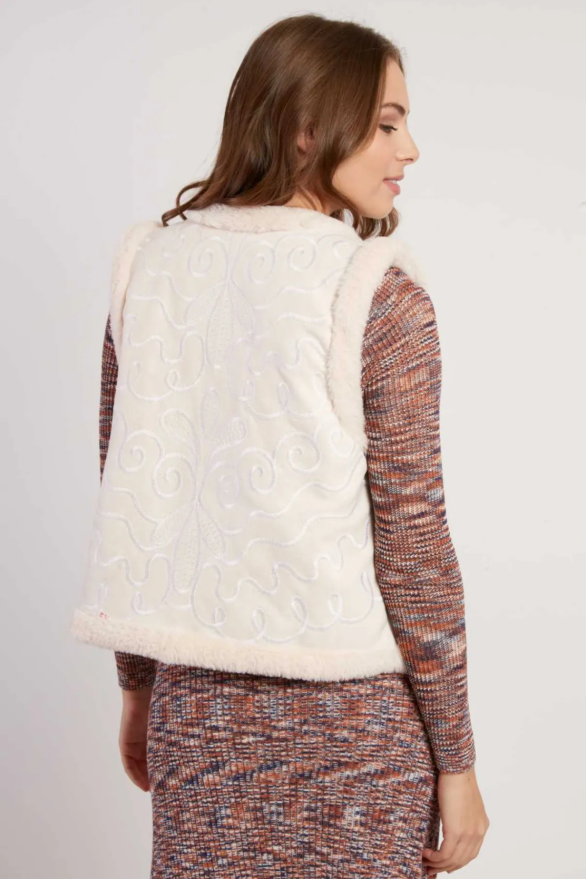 Gilet sans manches réversible. Un côté en simili suédine avec broderies élégantes, l’autre en fausse fourrure douce pour plus de confort. Veste chaude idéale la mi saison.
