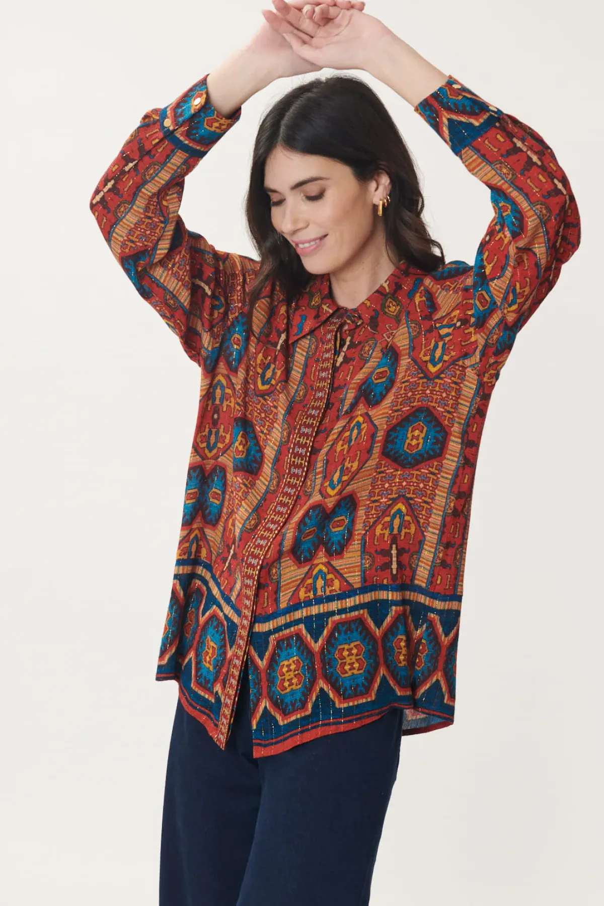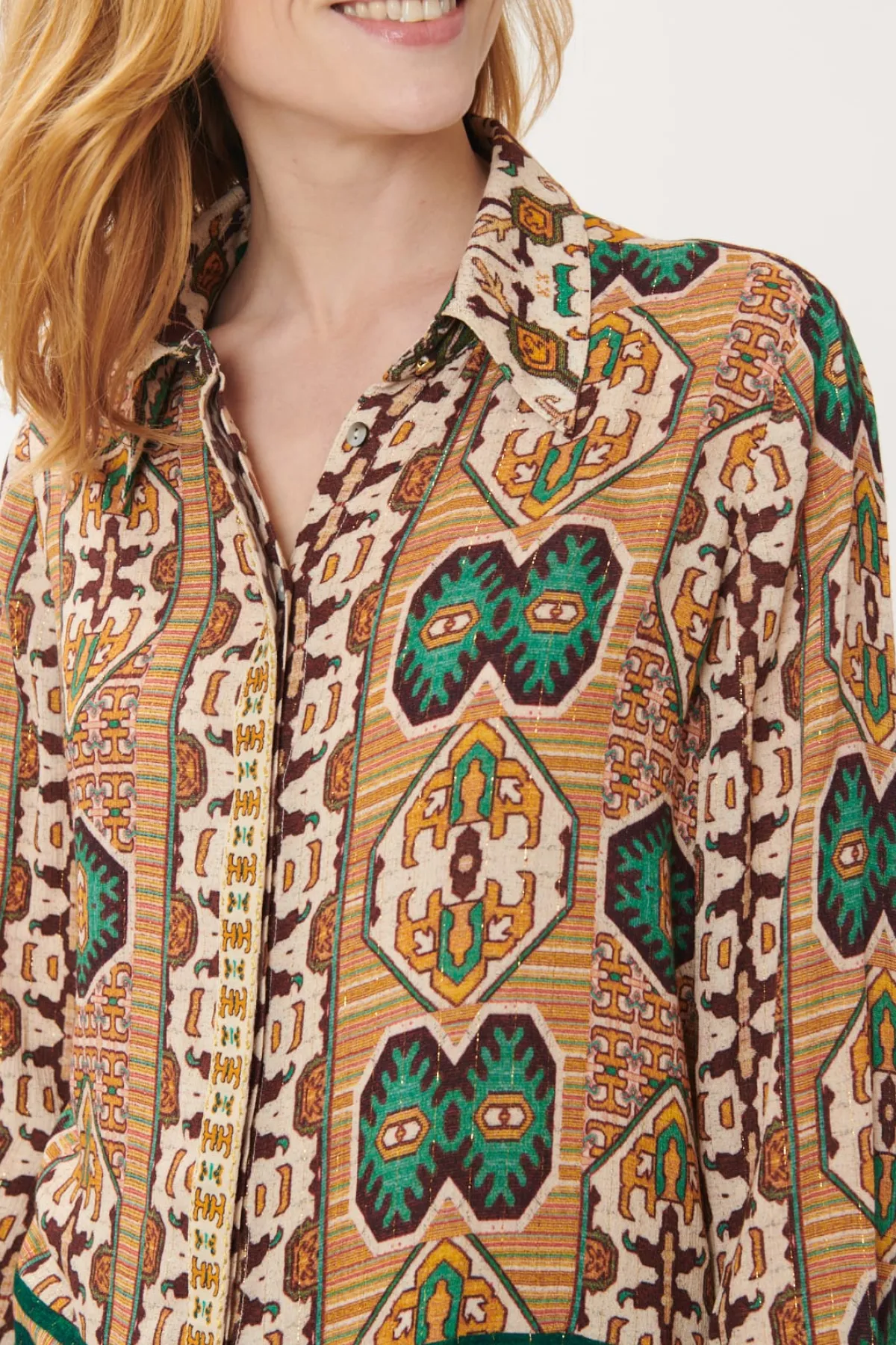 Chemise manches longues en crêpe imprimé rehaussé de fines rayures lurex, imprimé Ethnique avec bordures placées. Bande brodée le long de la plaquette de boutonnage.