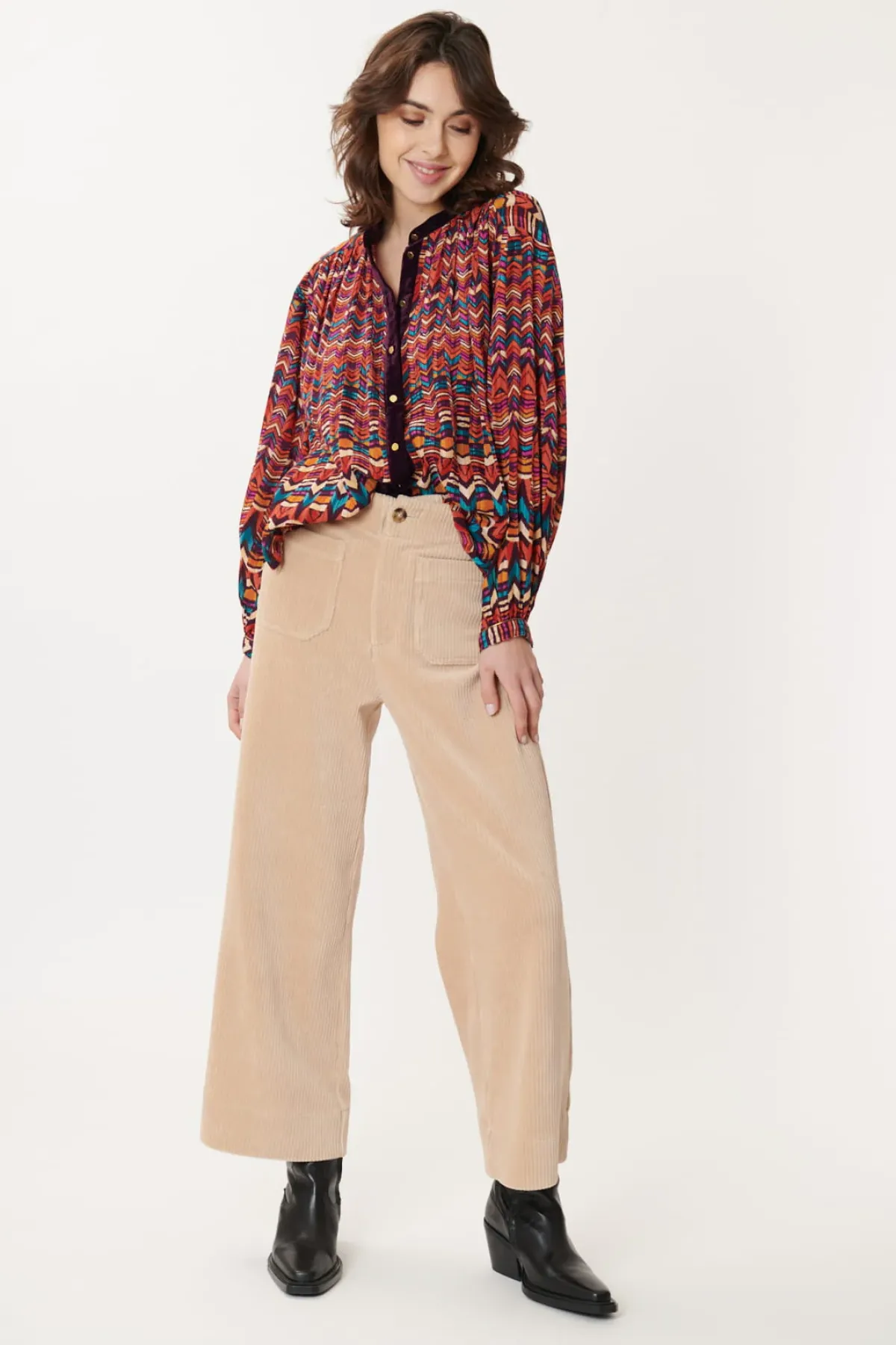 Chemise col officier en crêpe imprimé abstrait multicolore. Elle est ornée de velours uni au col et sur la plaquette de boutonnage, et d’un détail de lurex au-dessus des poignets. Cette chemise est parfaite pour un look chic et élégant. Commandez la votre dès maintenant !