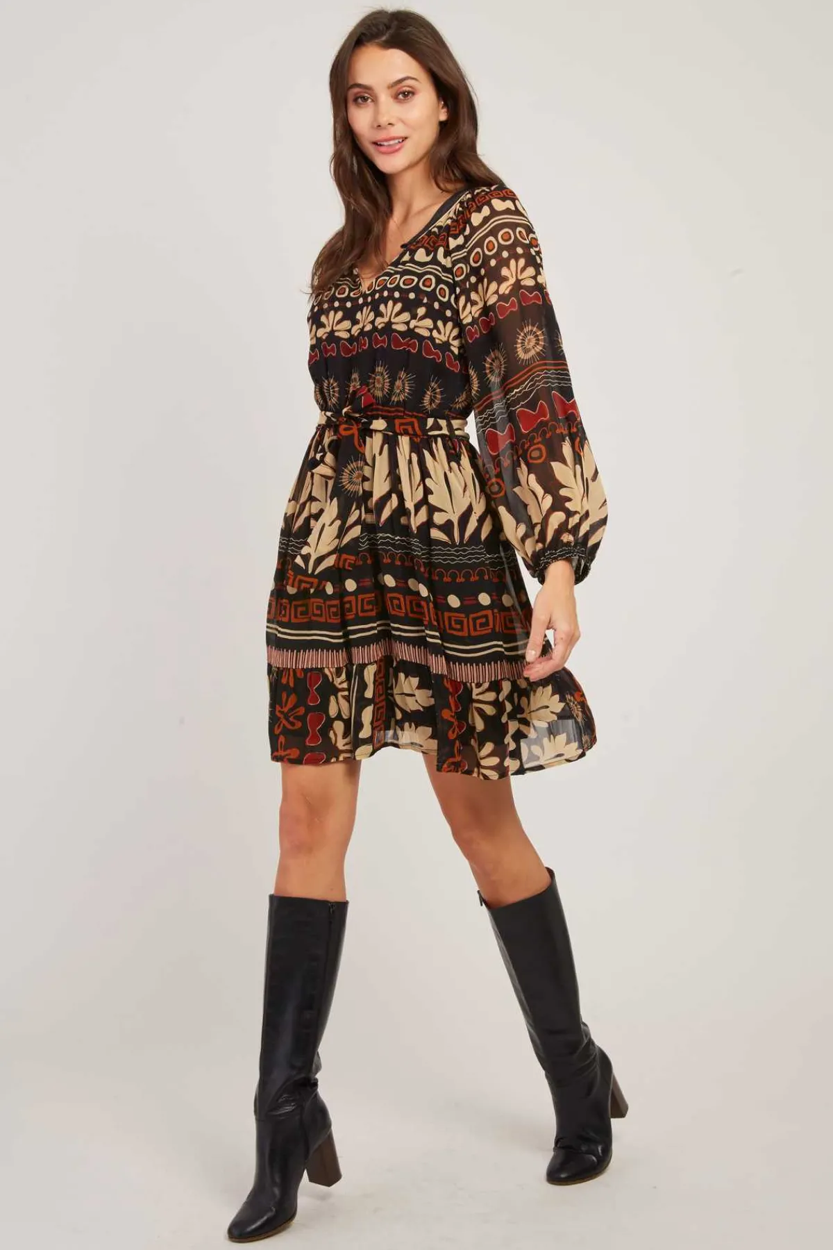 Robe courte avec imprimé floral et ethnique. Col rond avec ouverture fermée par un bouton en velours. Ceinturée à la taille pour une silhouette marquée. Manches longues avec transparence et jupe évasée en voile pour un effet fluide et élégant.