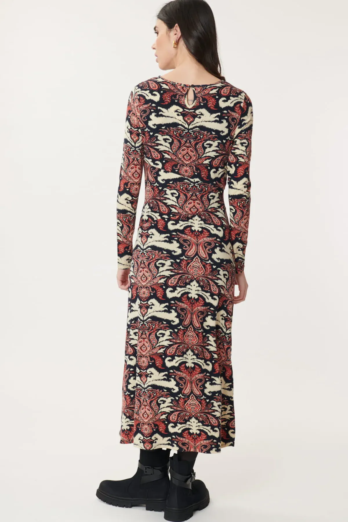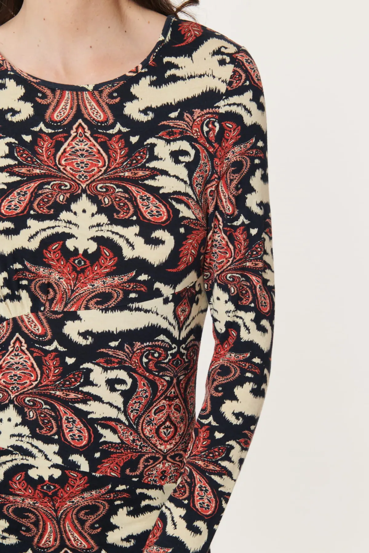 Robe longue manches longues en jersey stretch et imprimé Paisley. Cette robe possède un col rond et un effet drapé sur le côté de la taille avec des petits boutons.