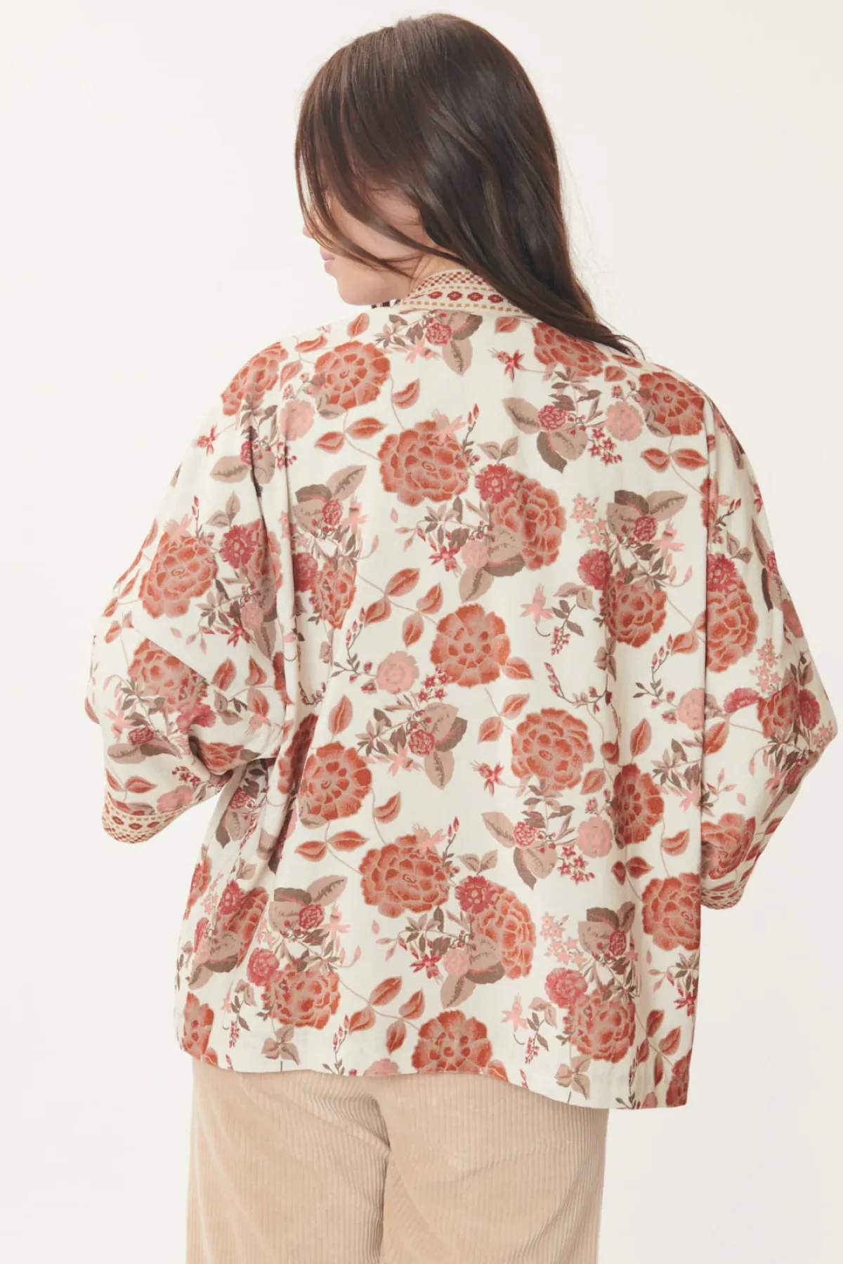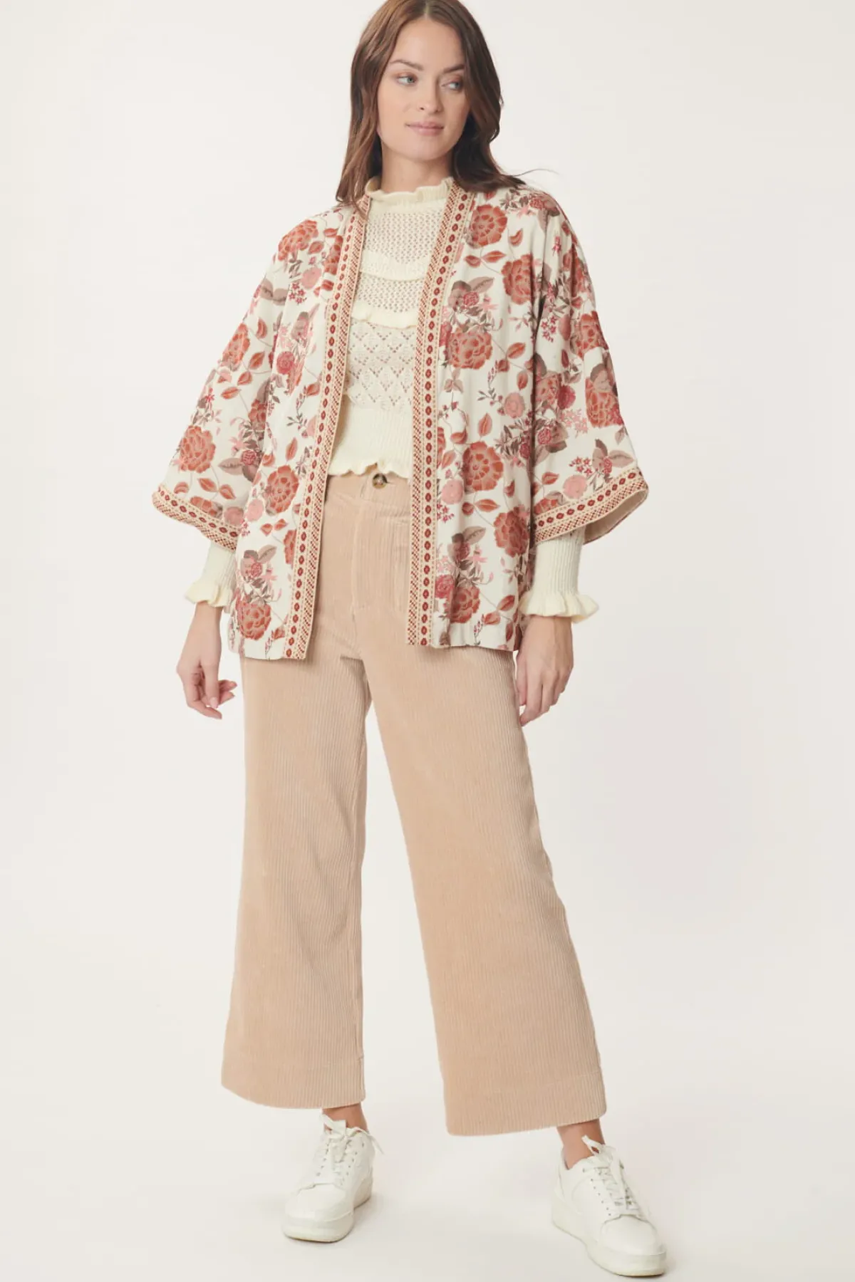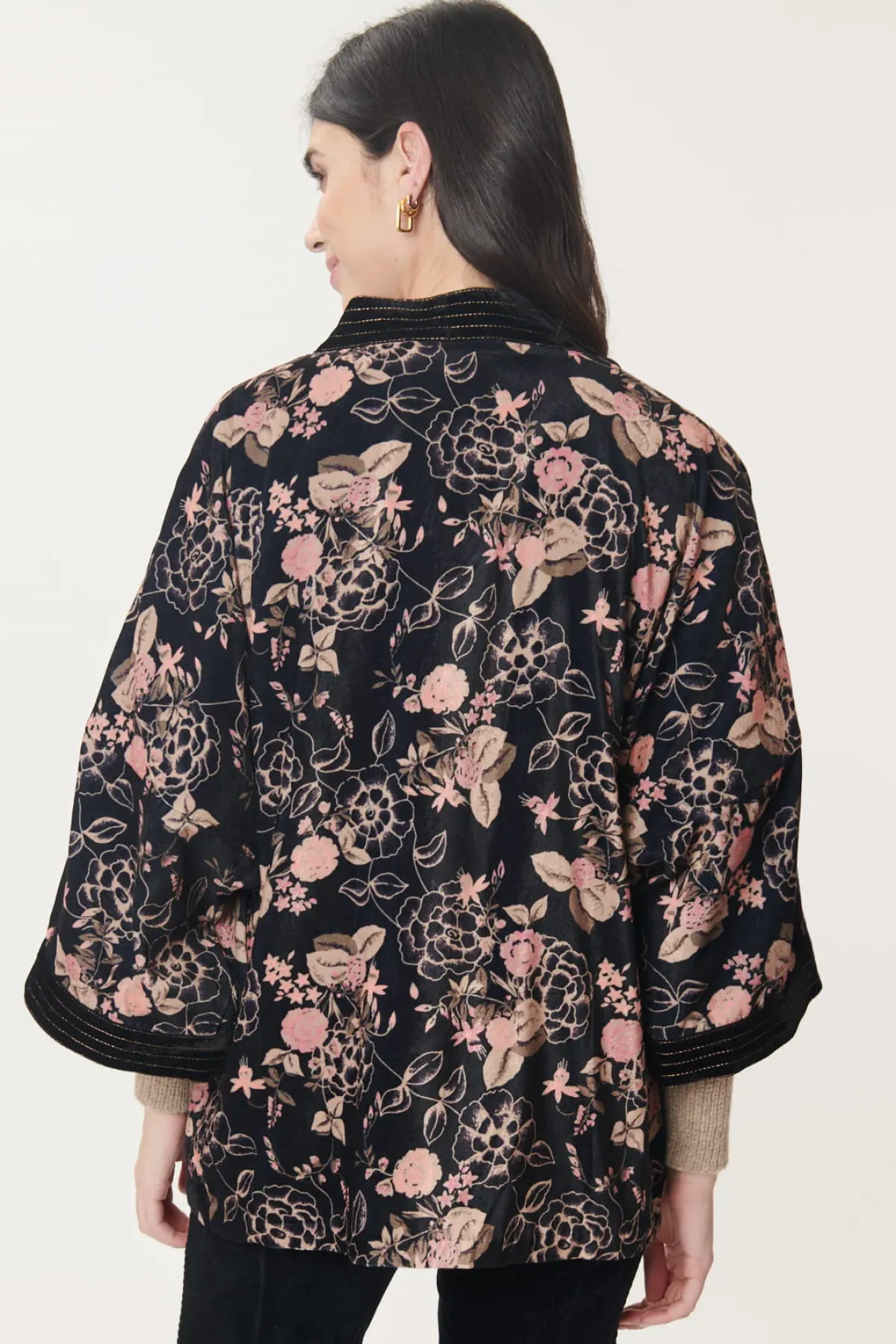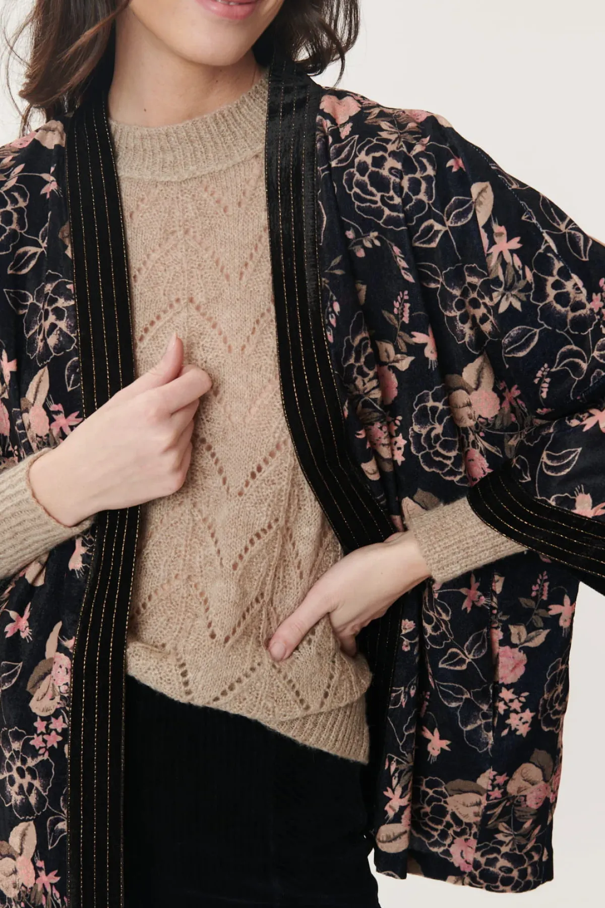 Veste kimono ouverte et courte en velours imprimé, entièrement doublée.