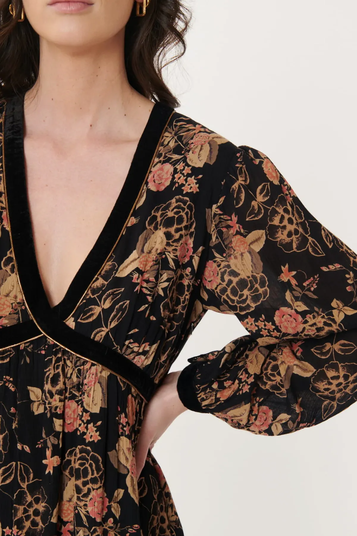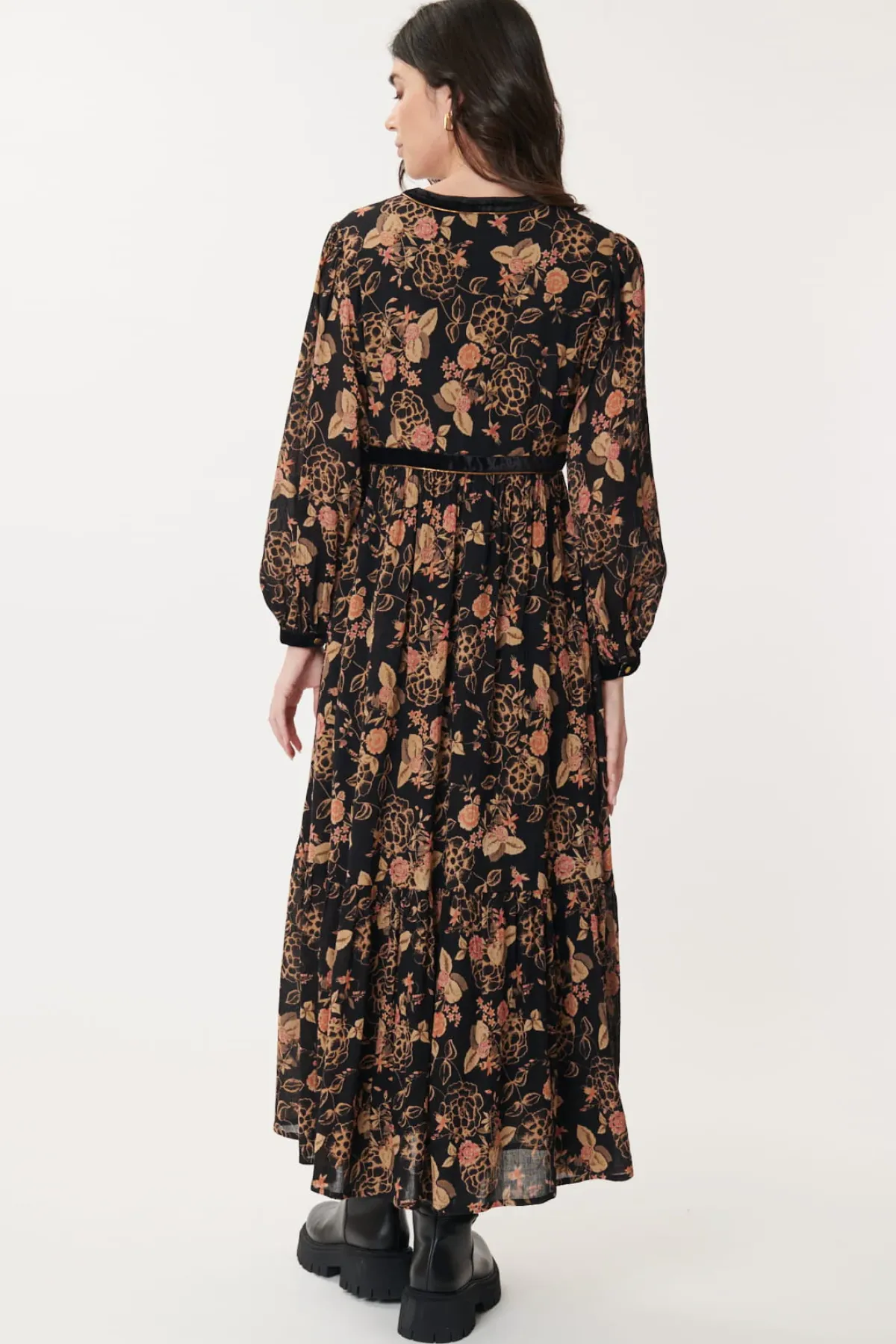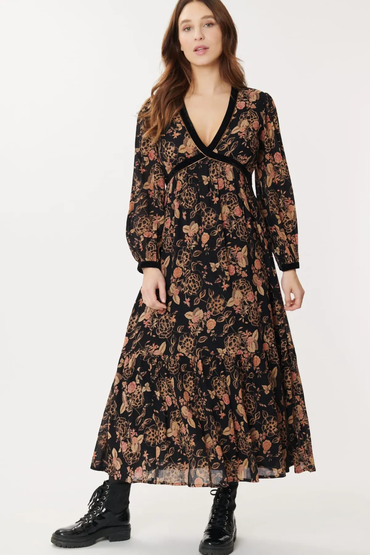 Robe longue en viscose imprimée, col V, manches longues, doublée en voile de coton.