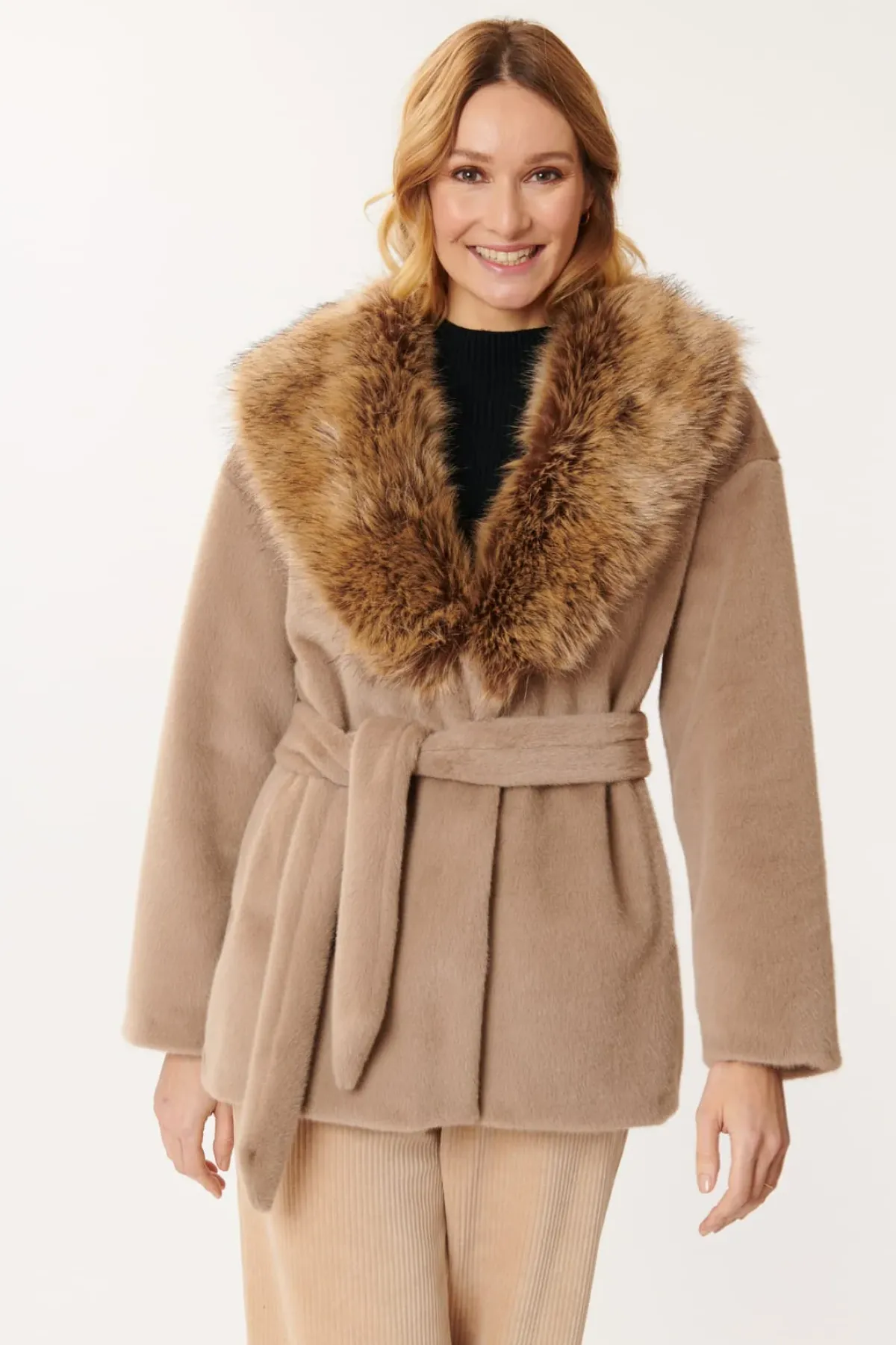Veste mi-longue en fausse fourrure poils courts avec grand col en fausse fourrure poils longs. Ceinture. Entièrement doublée en polyester. Poches sur les côtés.