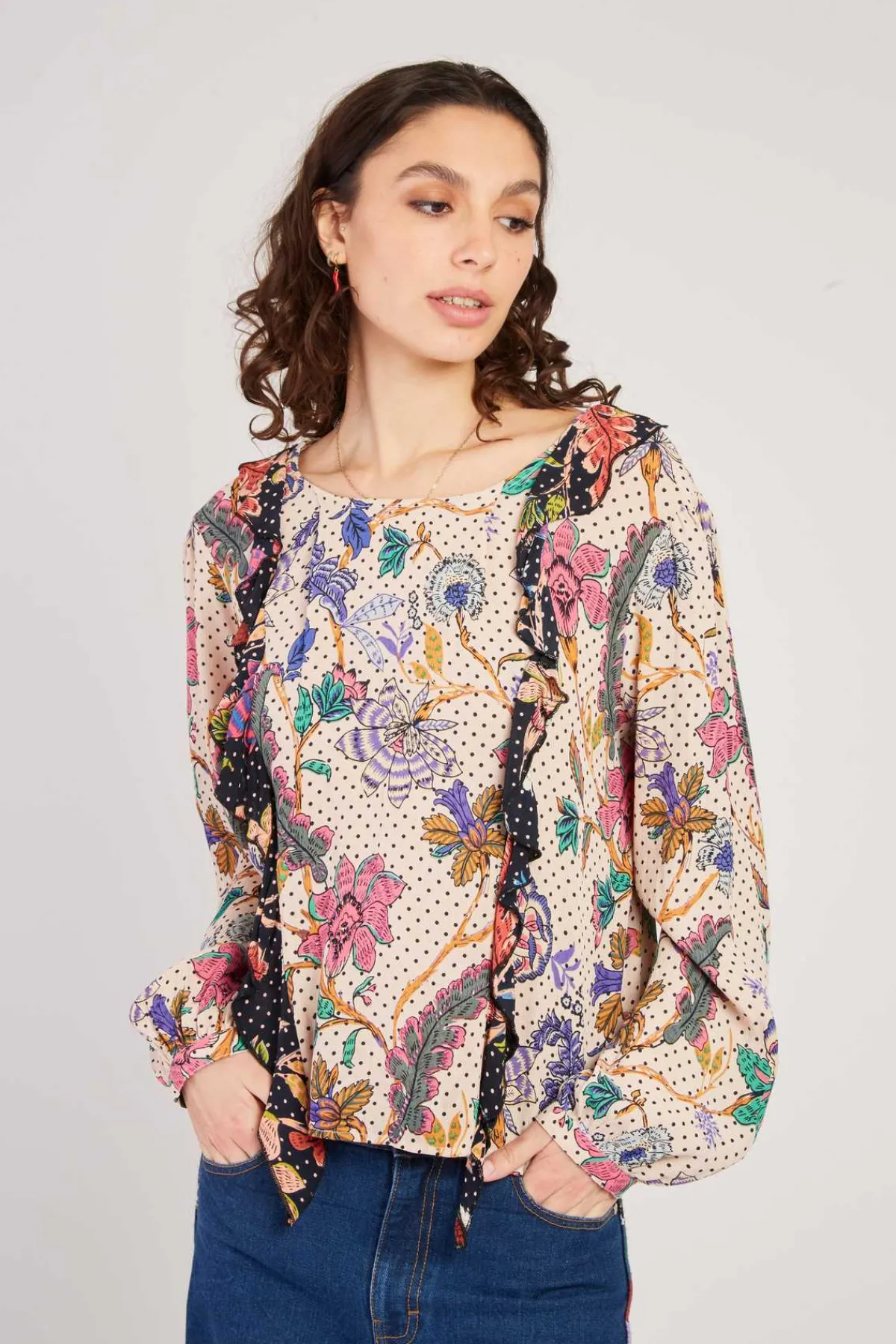Blouse avec des motifs floraux colorés et des pois en contraste, offrant beaucoup de féminité. Ses manches longues et bouffantes sont resserrées aux poignets, tandis que deux volants symétriques partent des épaules jusqu’en bas, devant et dans le dos. Le col rond se ferme par des boutons dissimulés à l’arrière. Sa coupe ample et fluide assure un confort optimal et un style raffiné.