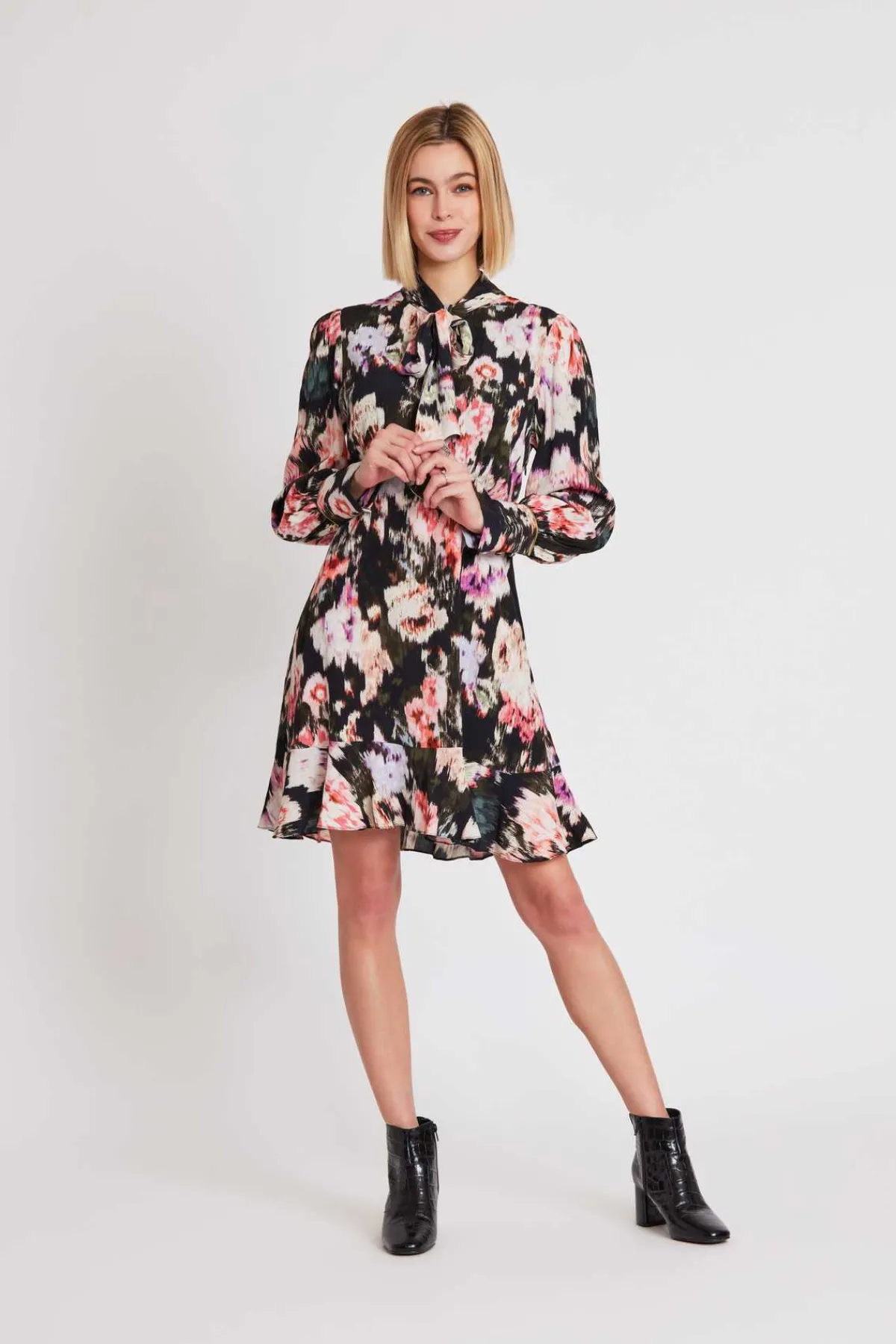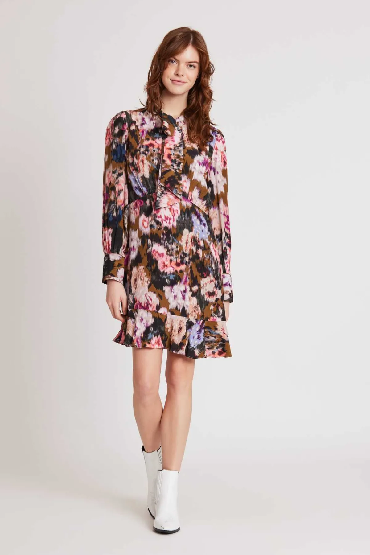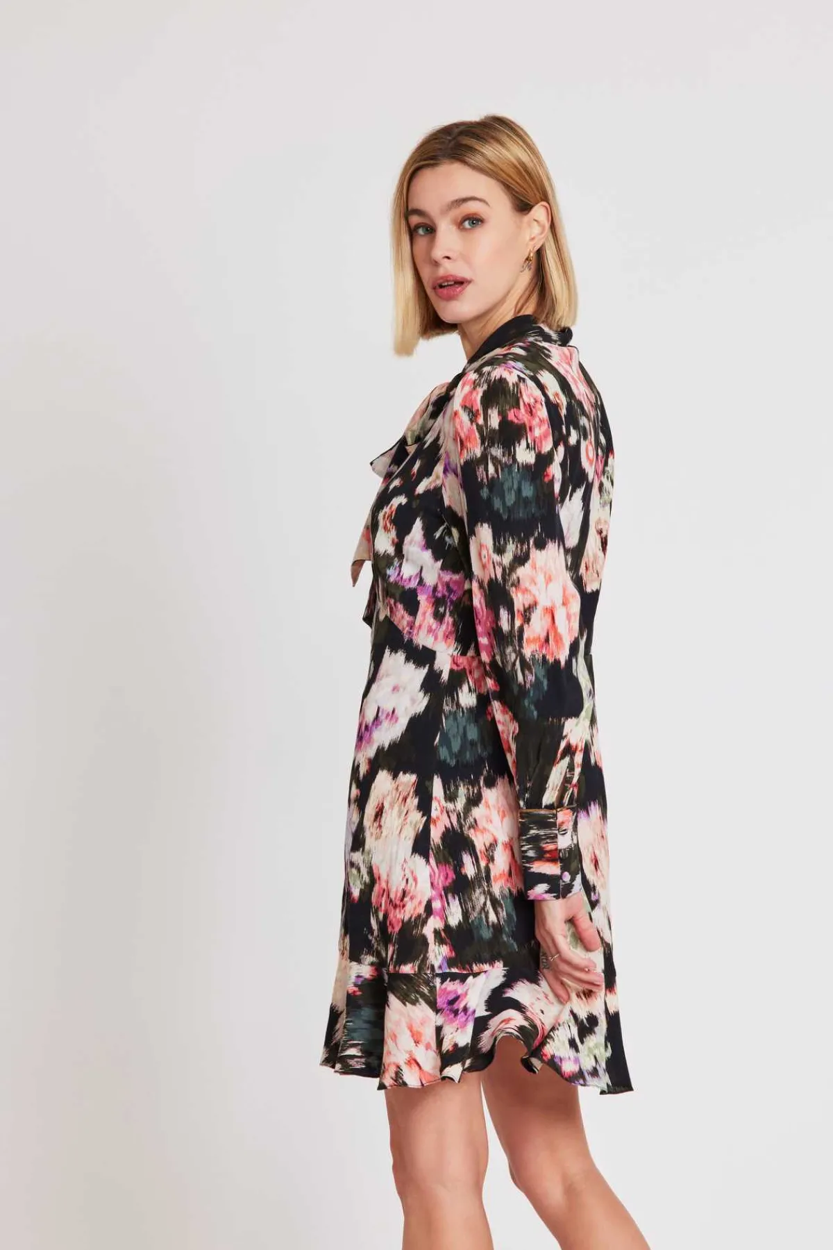 Robe courte en crêpe viscose, imprimé Romantique. Décolleté V surligné de doré et col Lavallière. Boutons dorés aux poignets. Zip coté. Doublure sur le haut.