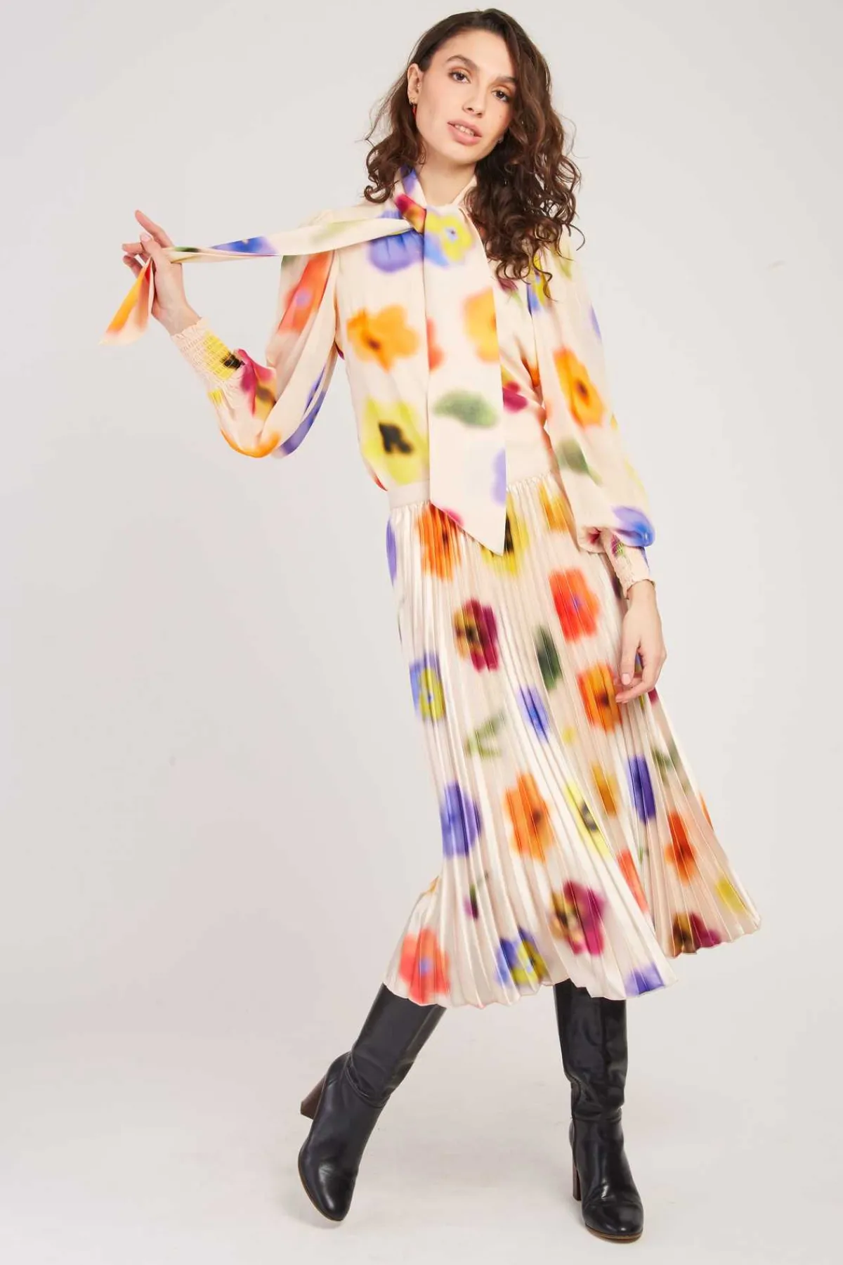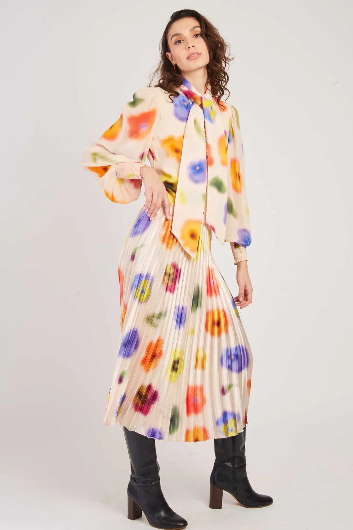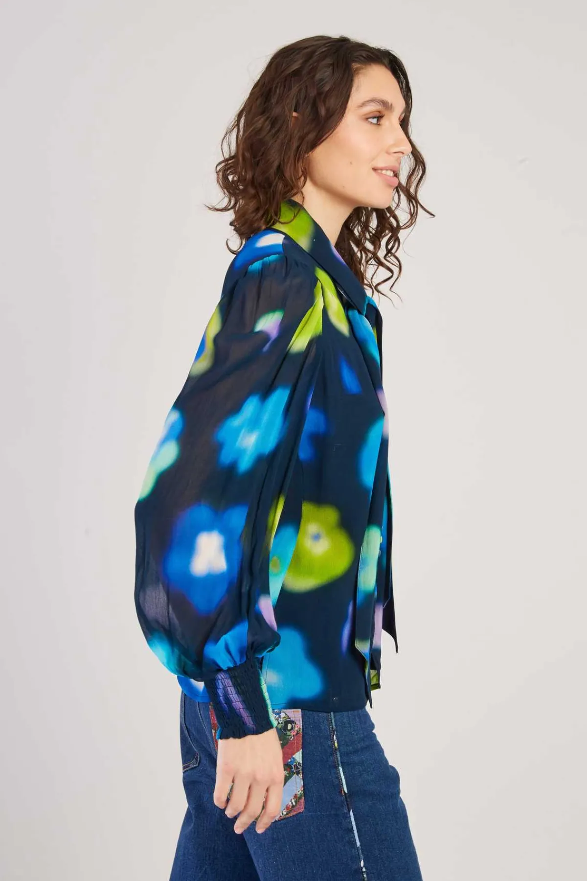 Blouse fluide en voile de viscose aux teintes vives. Col lavallière avec boutons décoratifs. Manches longues bouffantes maintenues par des poignets élastiques. La coupe ample et le tissu léger seront parfaits pour égayer votre mi-saison.