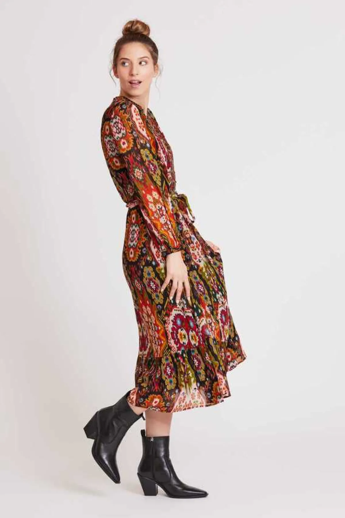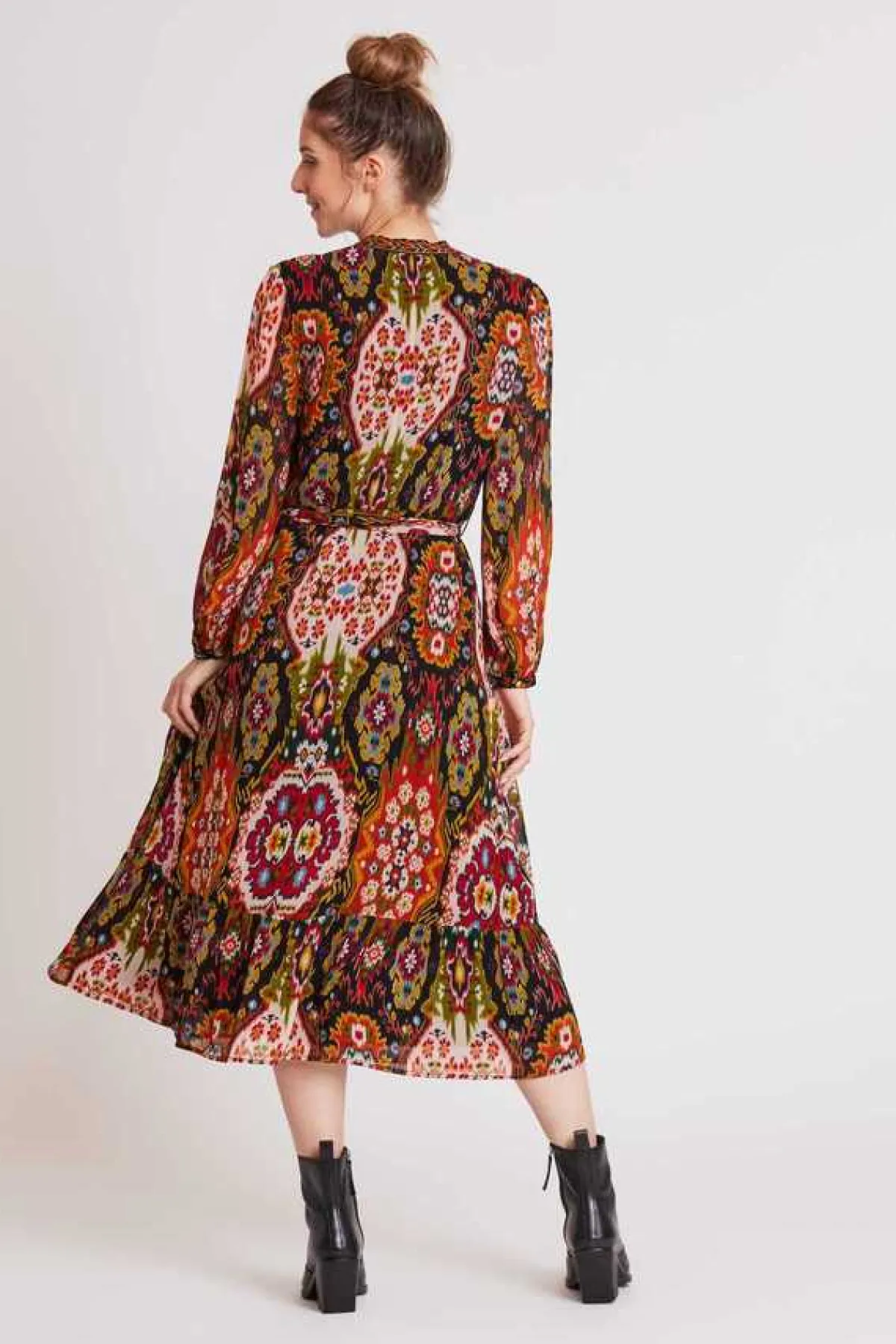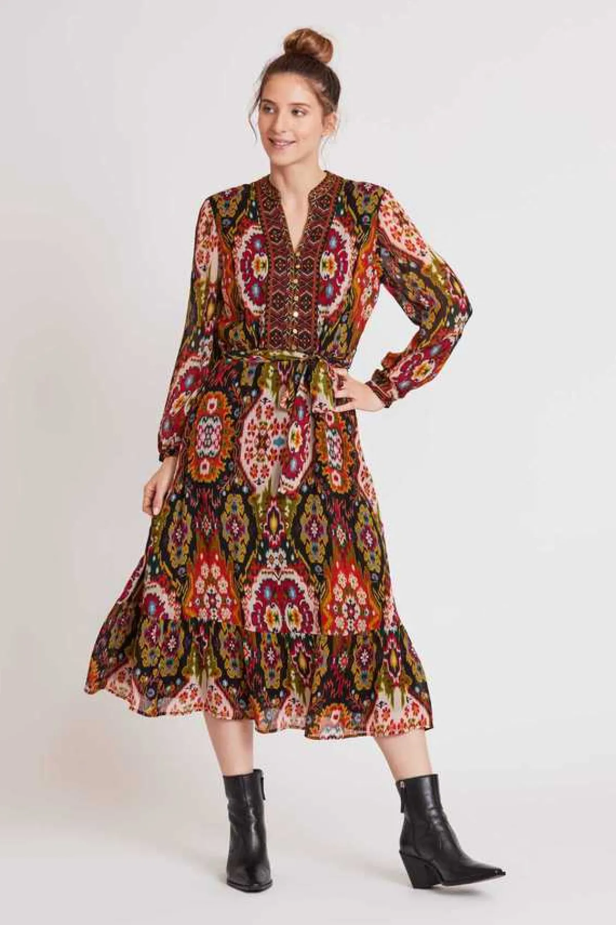 Robe midi manches longues en voile de viscose, imprimé Kilim. Galon brodé le long de l’encolure V jusqu’à la taille. Ceinture imprimée. Doublure sauf aux manches.