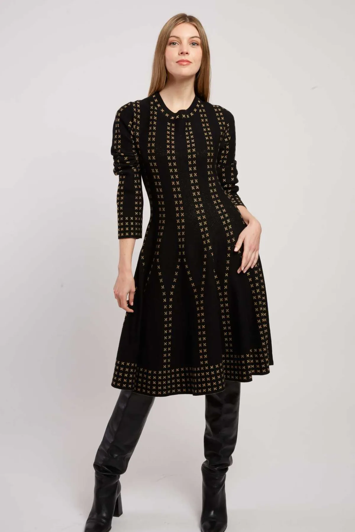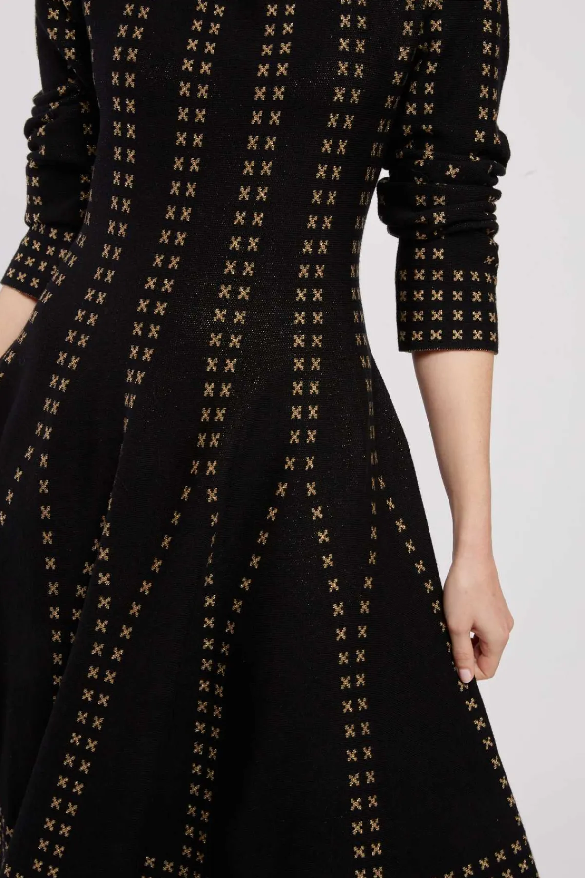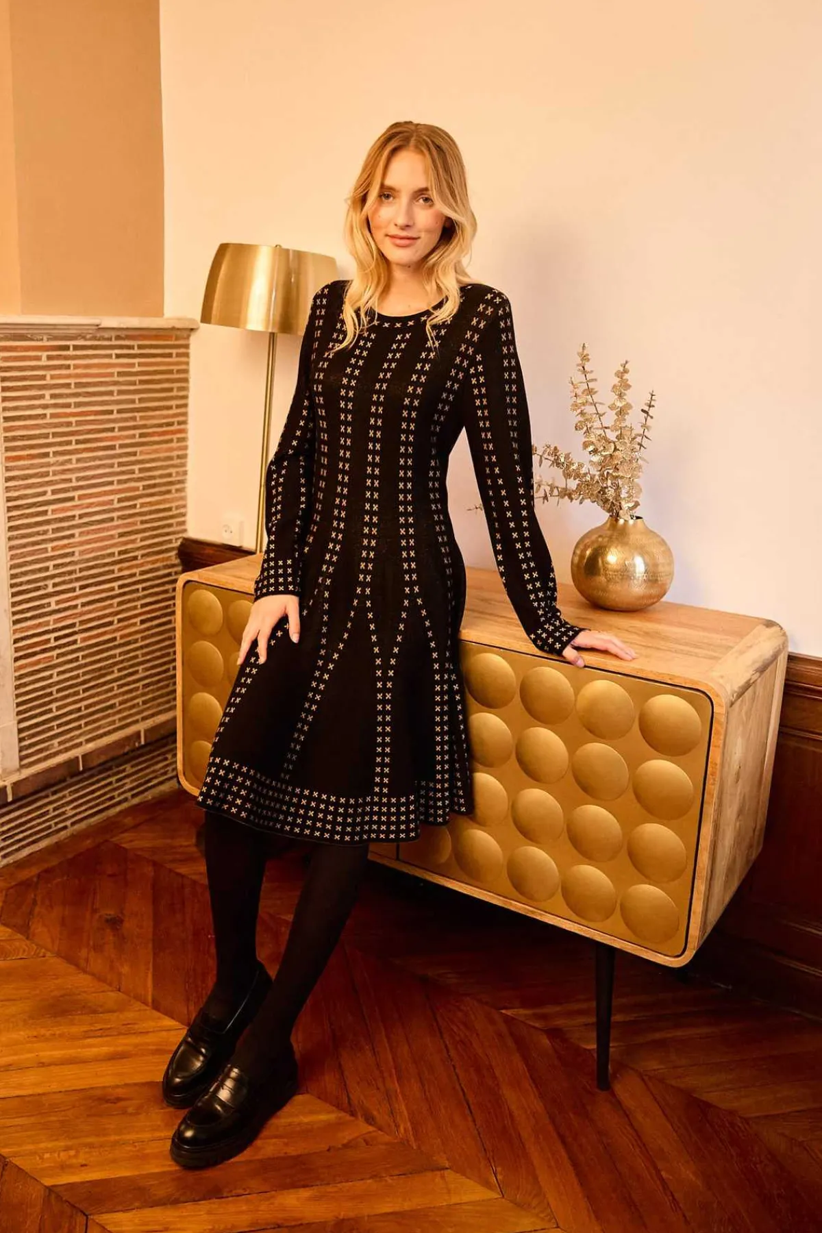 Robe courte en maille avec manches longues et jupe évasée plissée style patineuse. Détails graphiques en relief pour une touche moderne. Col rond classique, parfaite pour un look chic et confortable.