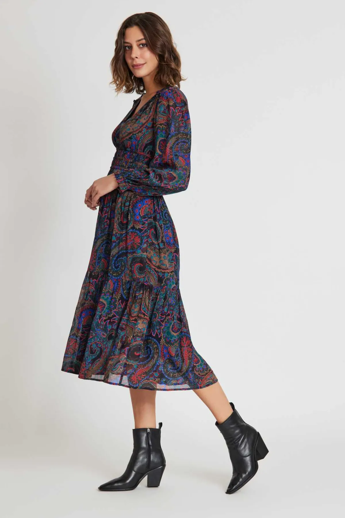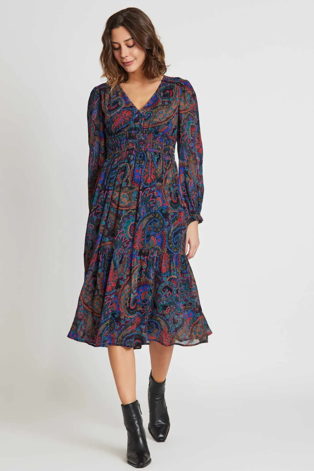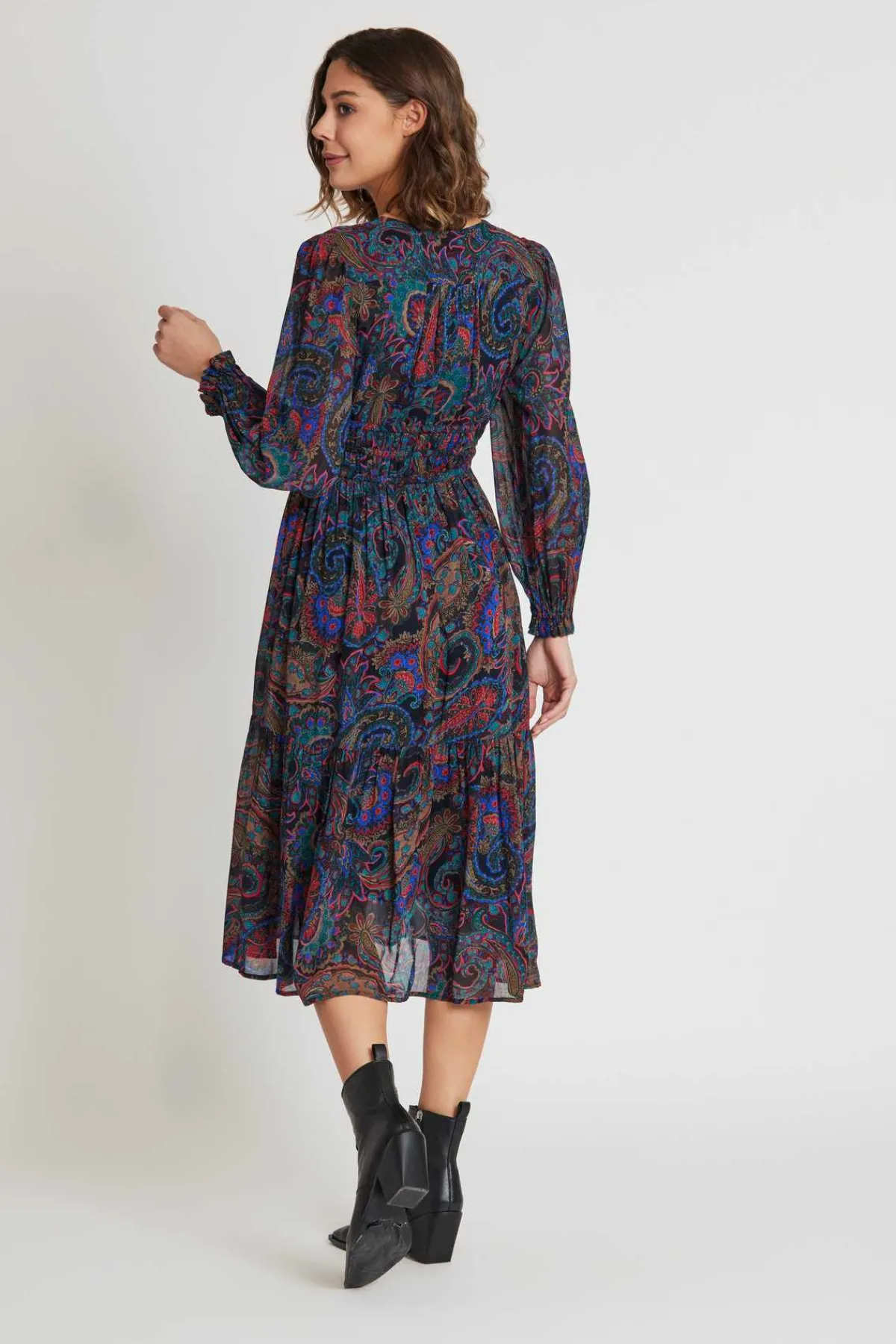 Robe midi manches longues en voile de viscose, imprimé Paisley. Col V. 3 rangées d’élastiques et fronces à la taille. Broderies de sequins à l’encolure et aux épaules. Poignets élastiqués. Doublure.