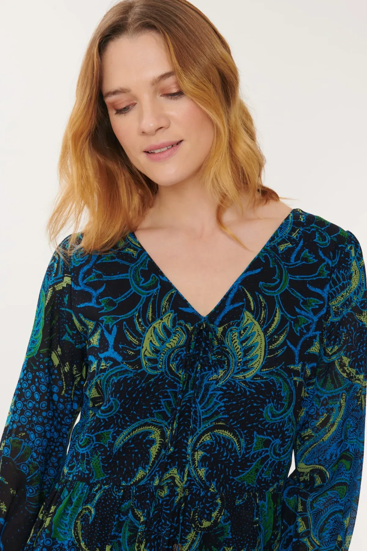 Robe mi-longue en viscose imprimée, col V, manches longues