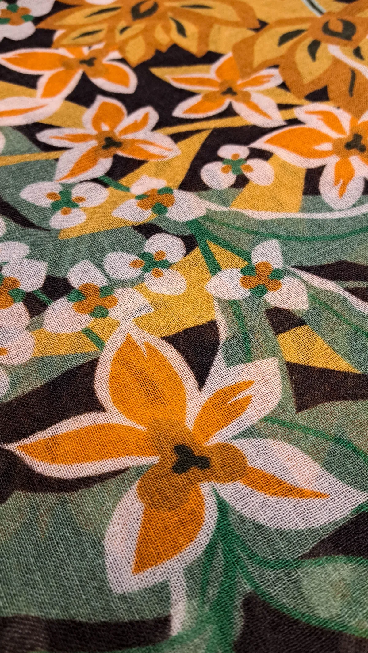 Étole imprimée en laine, imprimé floral. Franges sur les bords.