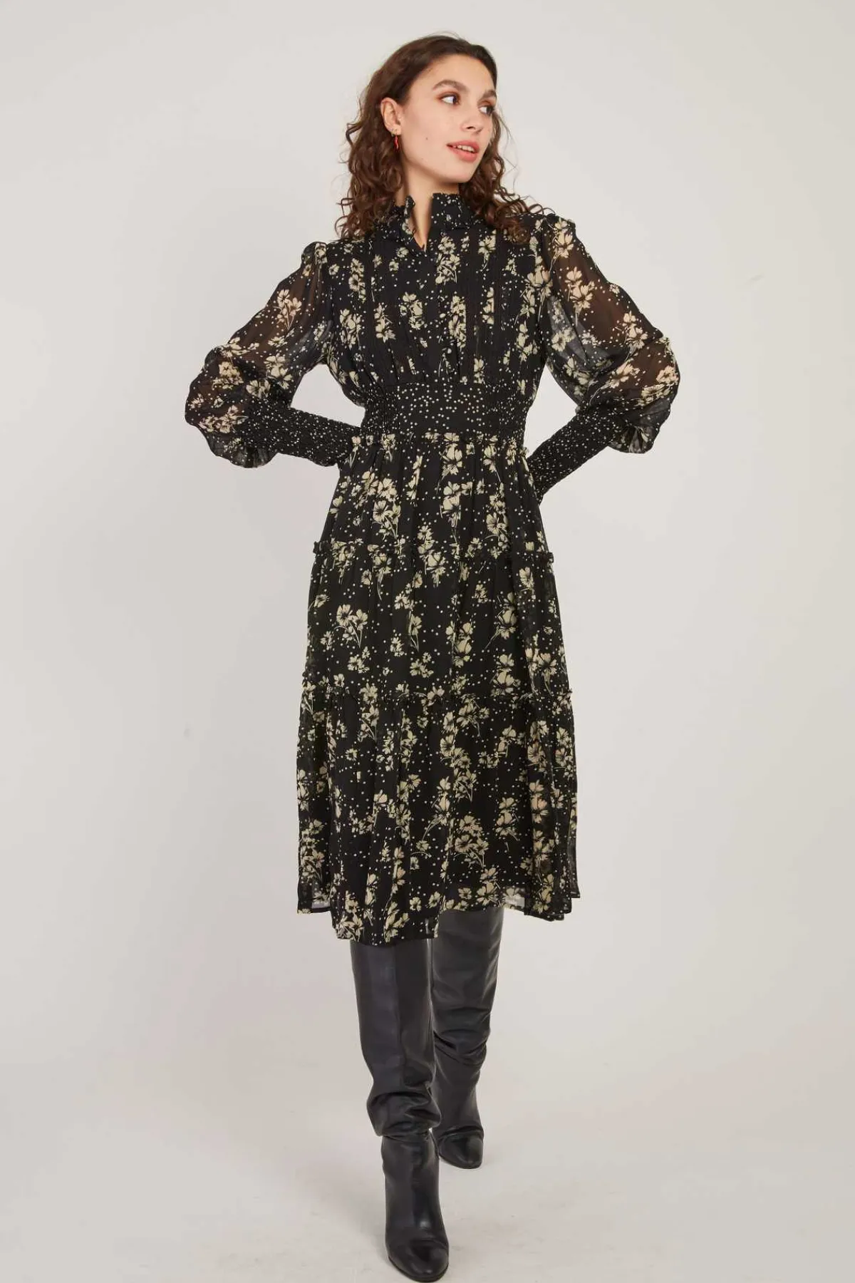 Robe mi-longue à imprimé floral, confectionnée en tissu effet voile pour une allure féminine et légère. Ses manches longues bouffantes, dotées d’élastiques aux poignets, ajoutent une touche d’élégance. Le col montant et la taille élastiquée mettent en valeur la silhouette, tandis que la jupe évasée offre une fluidité parfaite. Une pièce idéale pour un look chic et raffiné.