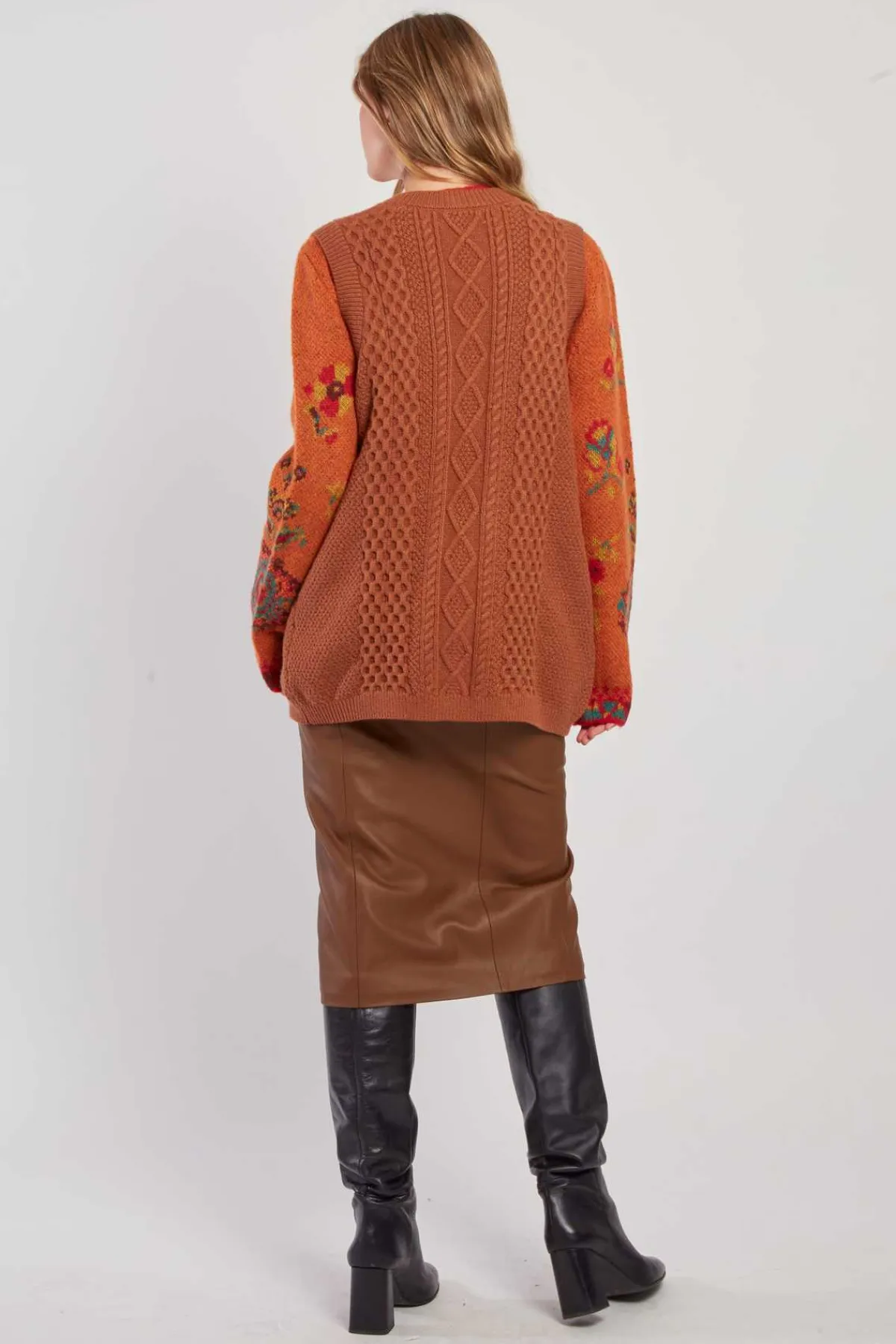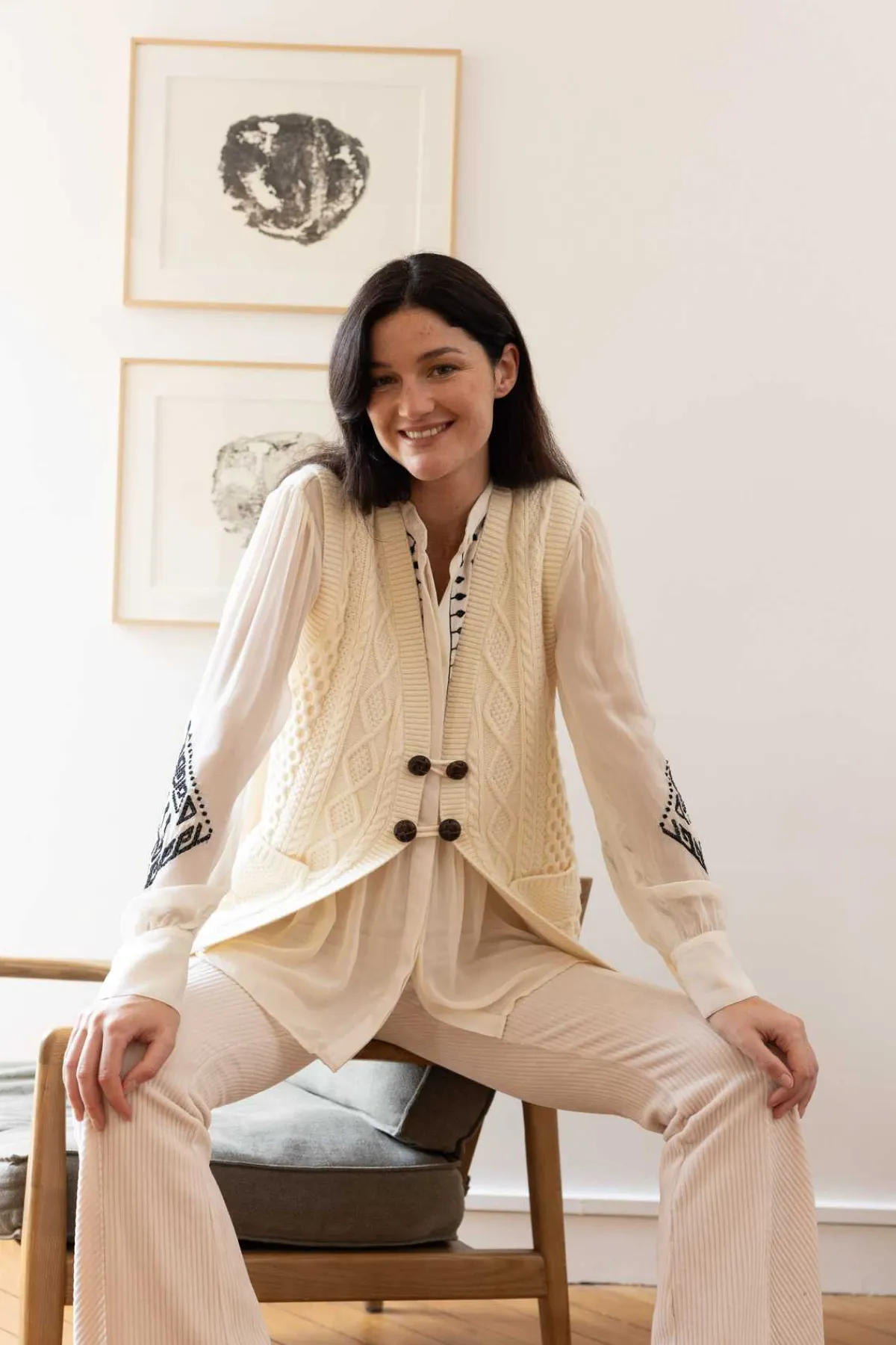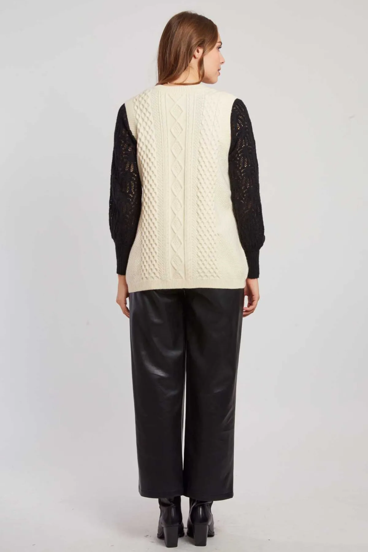 Gilet en maille sans manches, col V. Uni en maille épaisse torsadée avec fermeture boutonnée à l’avant et deux poches pratiques. Idéal pour un look casual-chic.