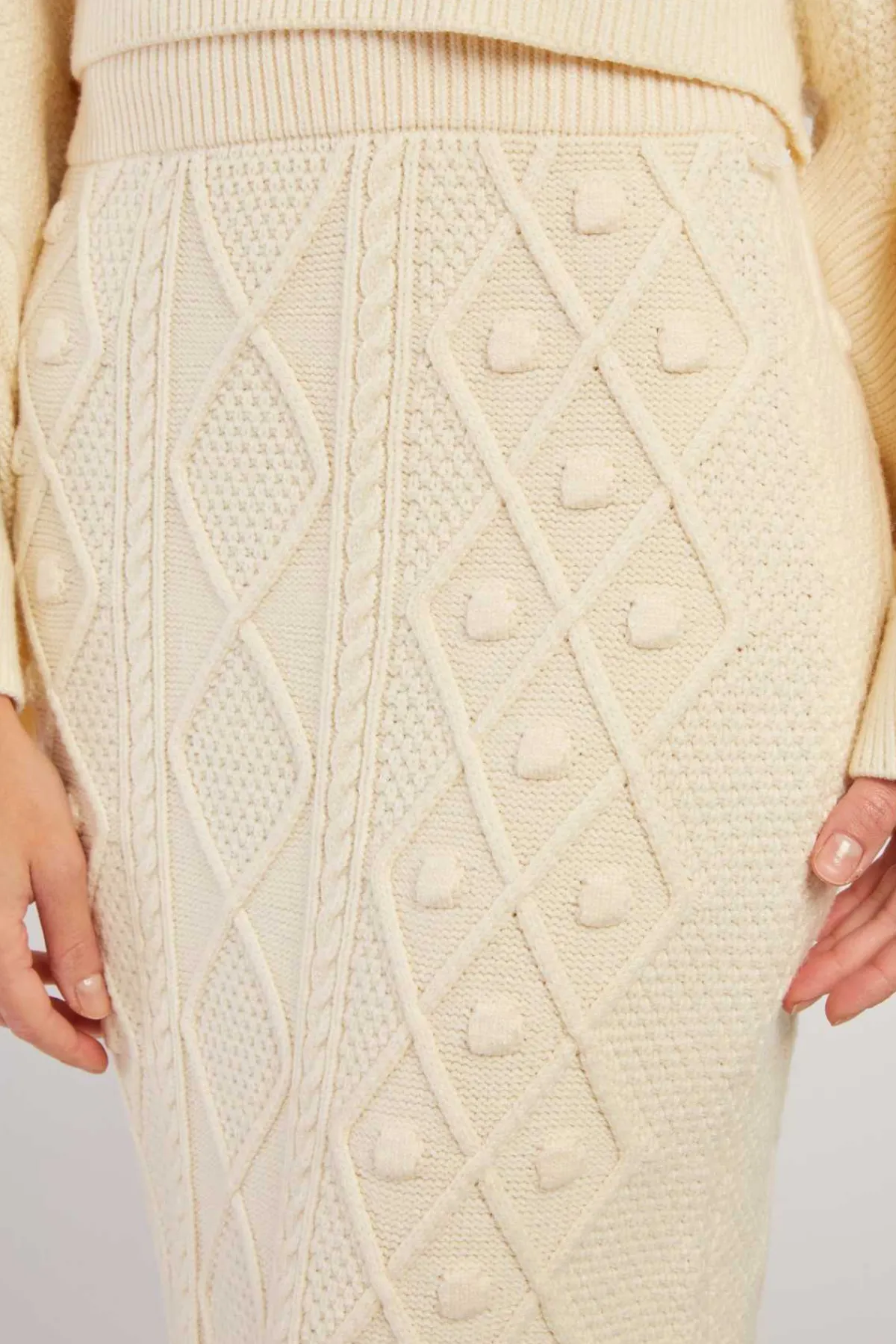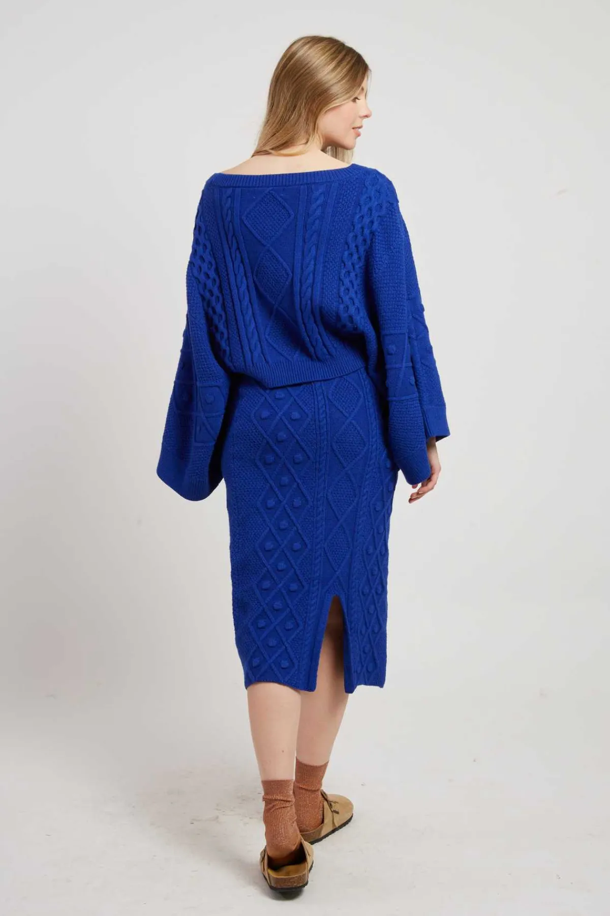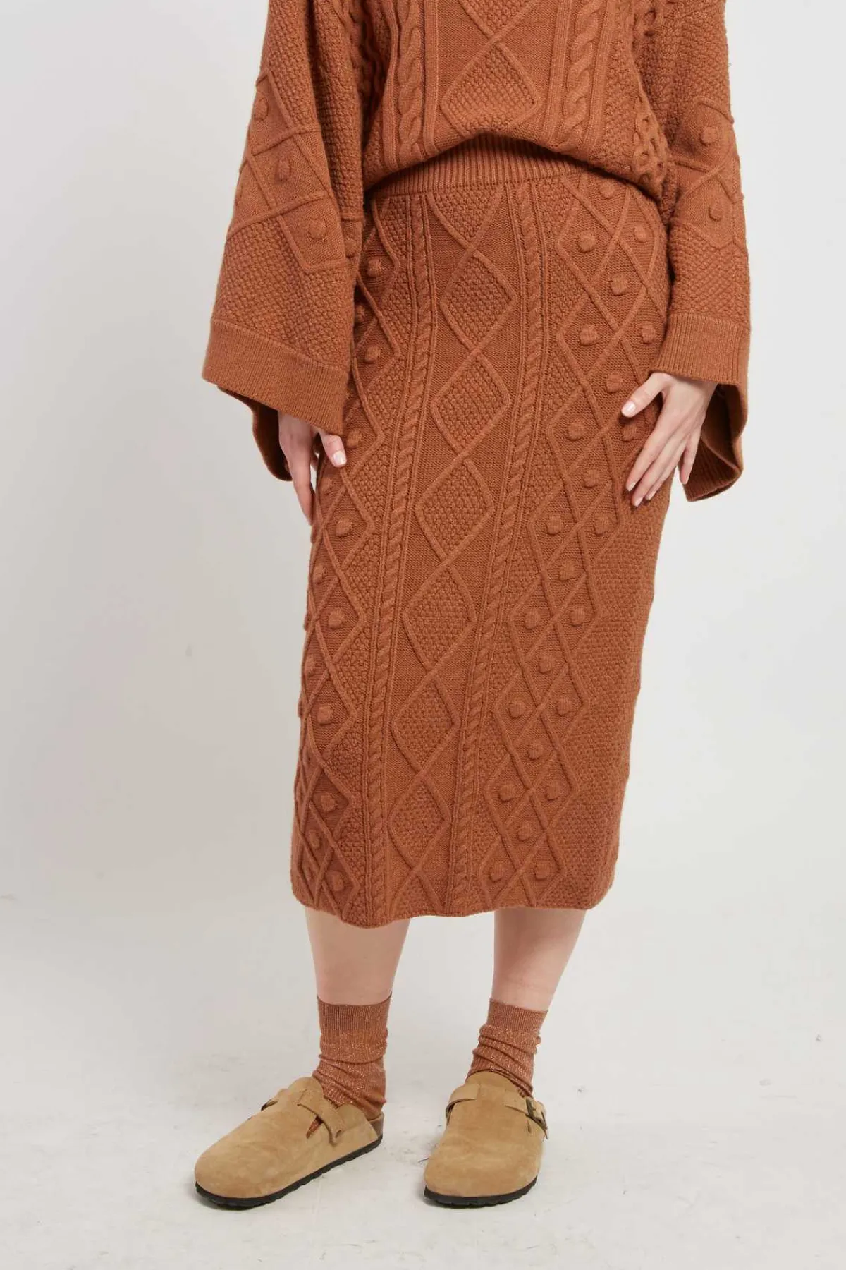 Jupe mi-longue en maille épaisse tressée. Modèle élastiqué à la taille pour un confort optimal. Fente discrète à l’arrière. Parfaite pour l’hiver, elle allie style et chaleur.