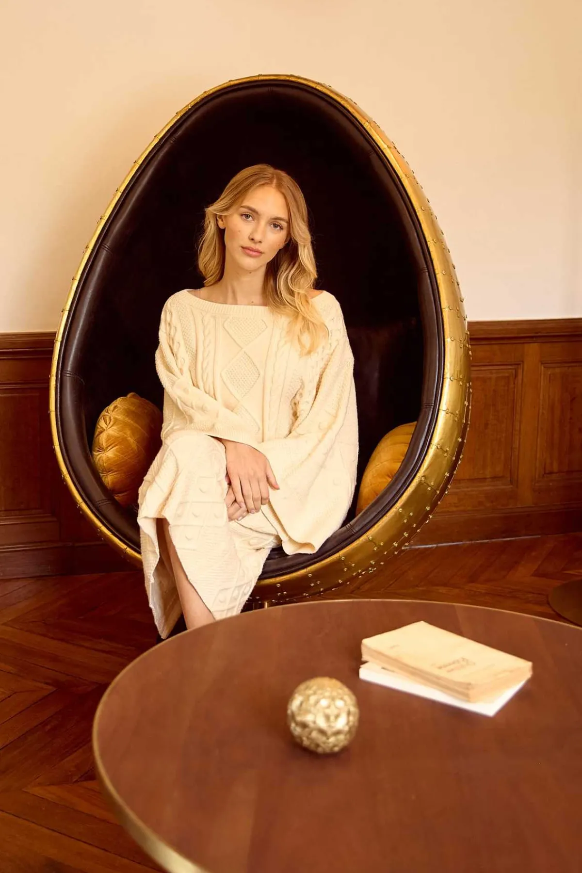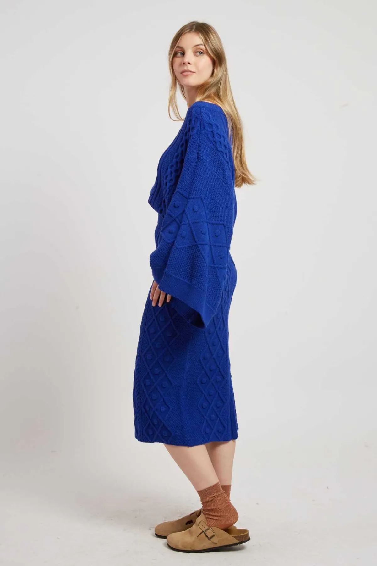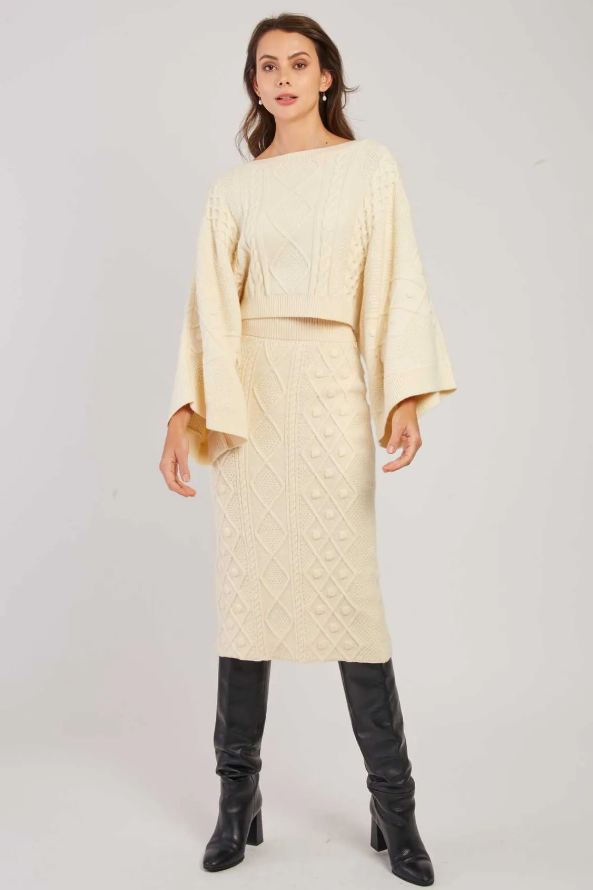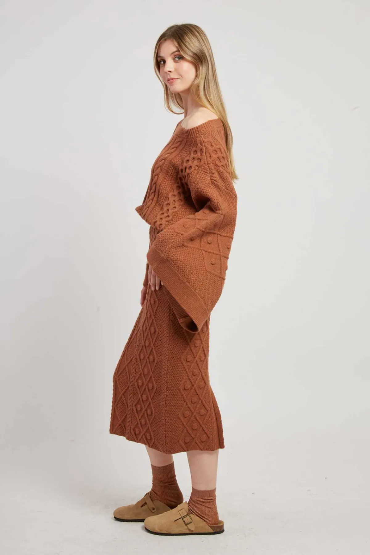 Jupe mi-longue en maille épaisse tressée. Modèle élastiqué à la taille pour un confort optimal. Fente discrète à l’arrière. Parfaite pour l’hiver, elle allie style et chaleur.