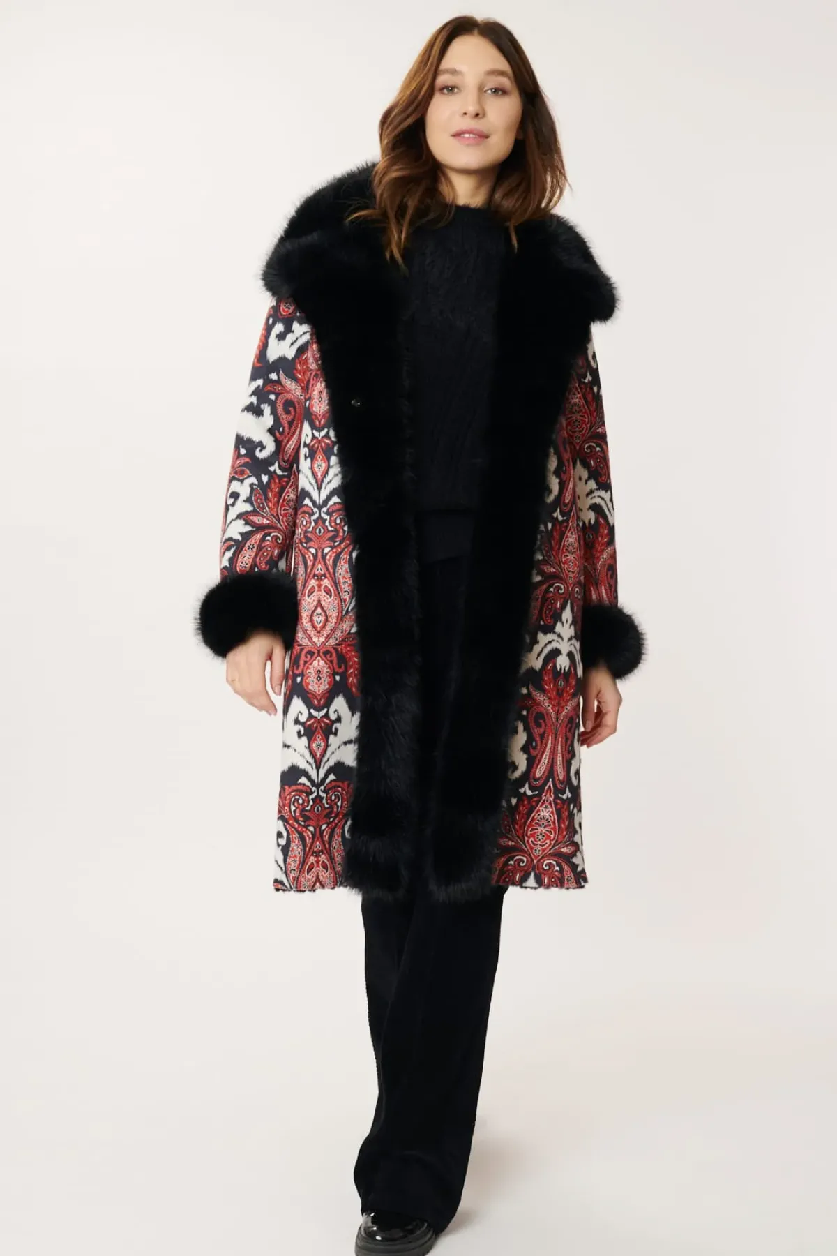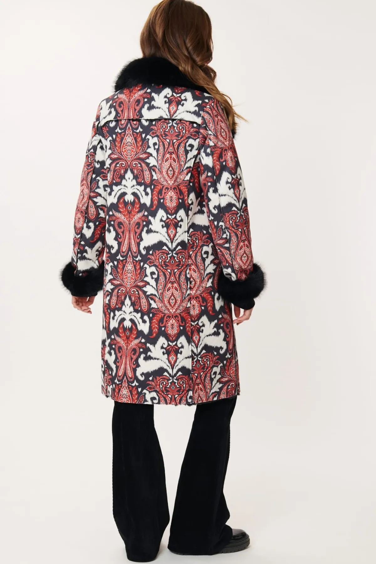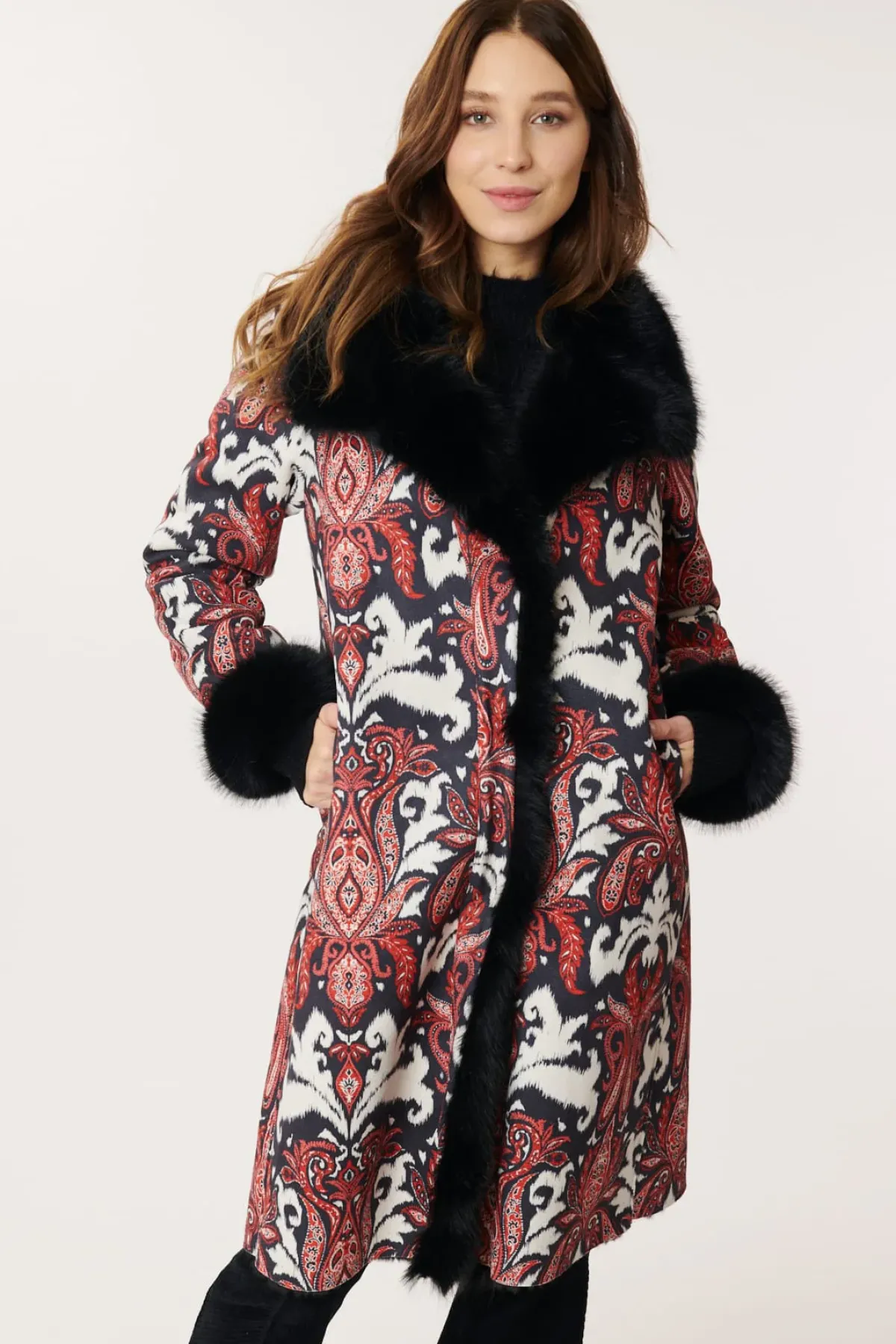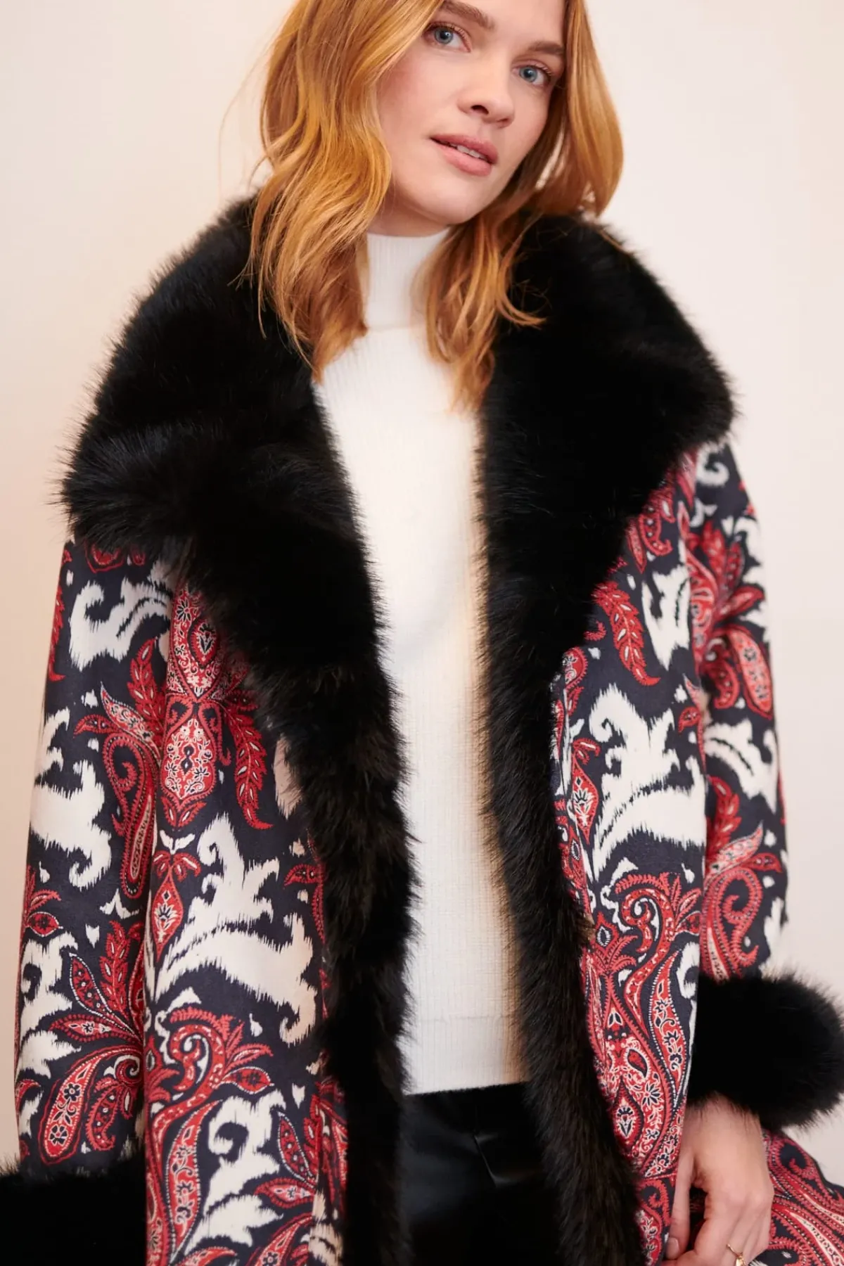 Long manteau au fausse peau retournée, imprimé Paisley. Intérieur en fausse fourrure rase. Col et poignets en fausse fourrure poils longs. Poches. Fermeture par pressions.